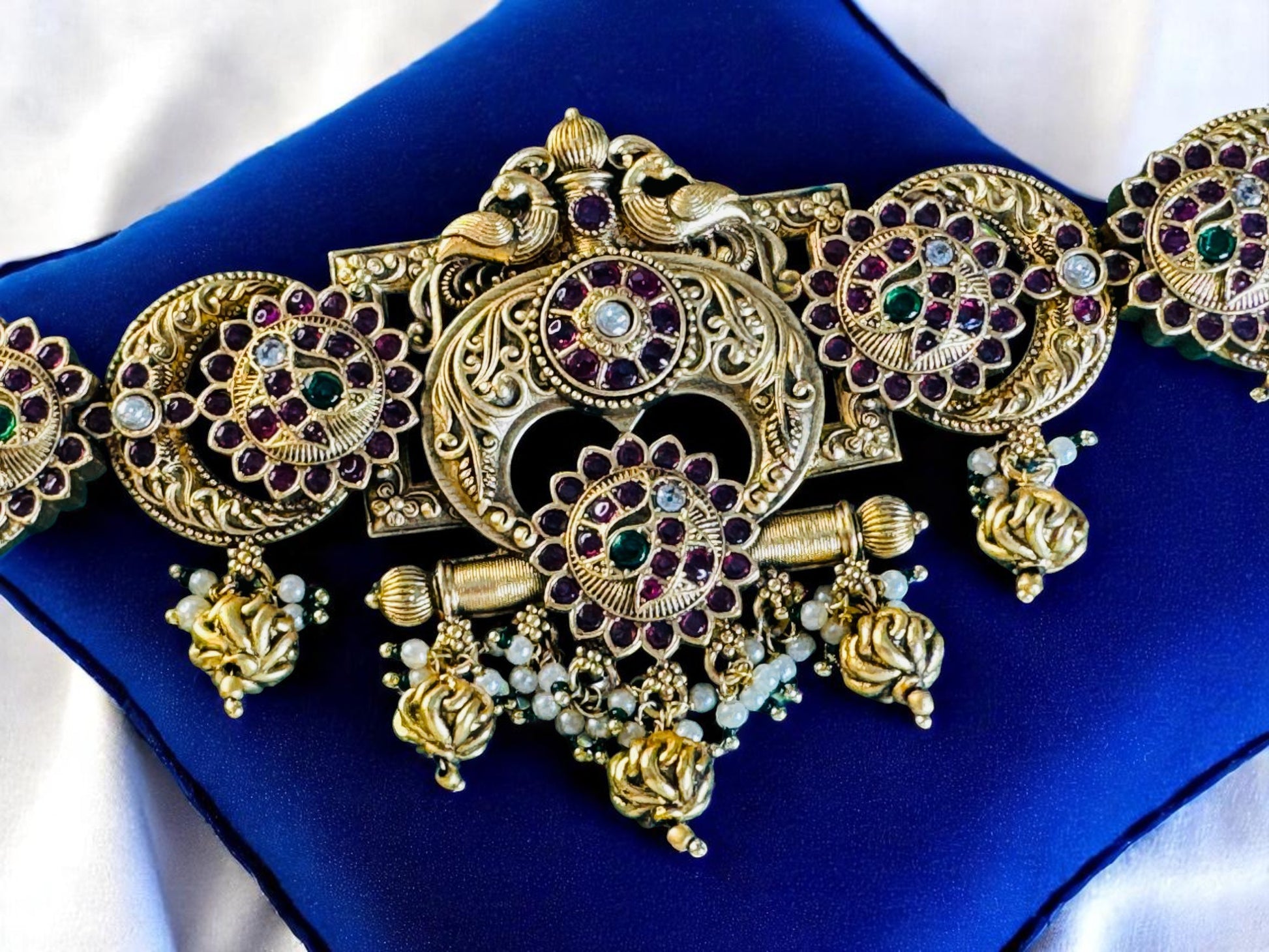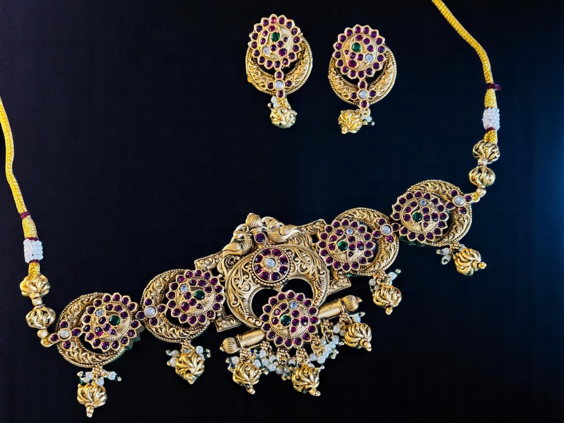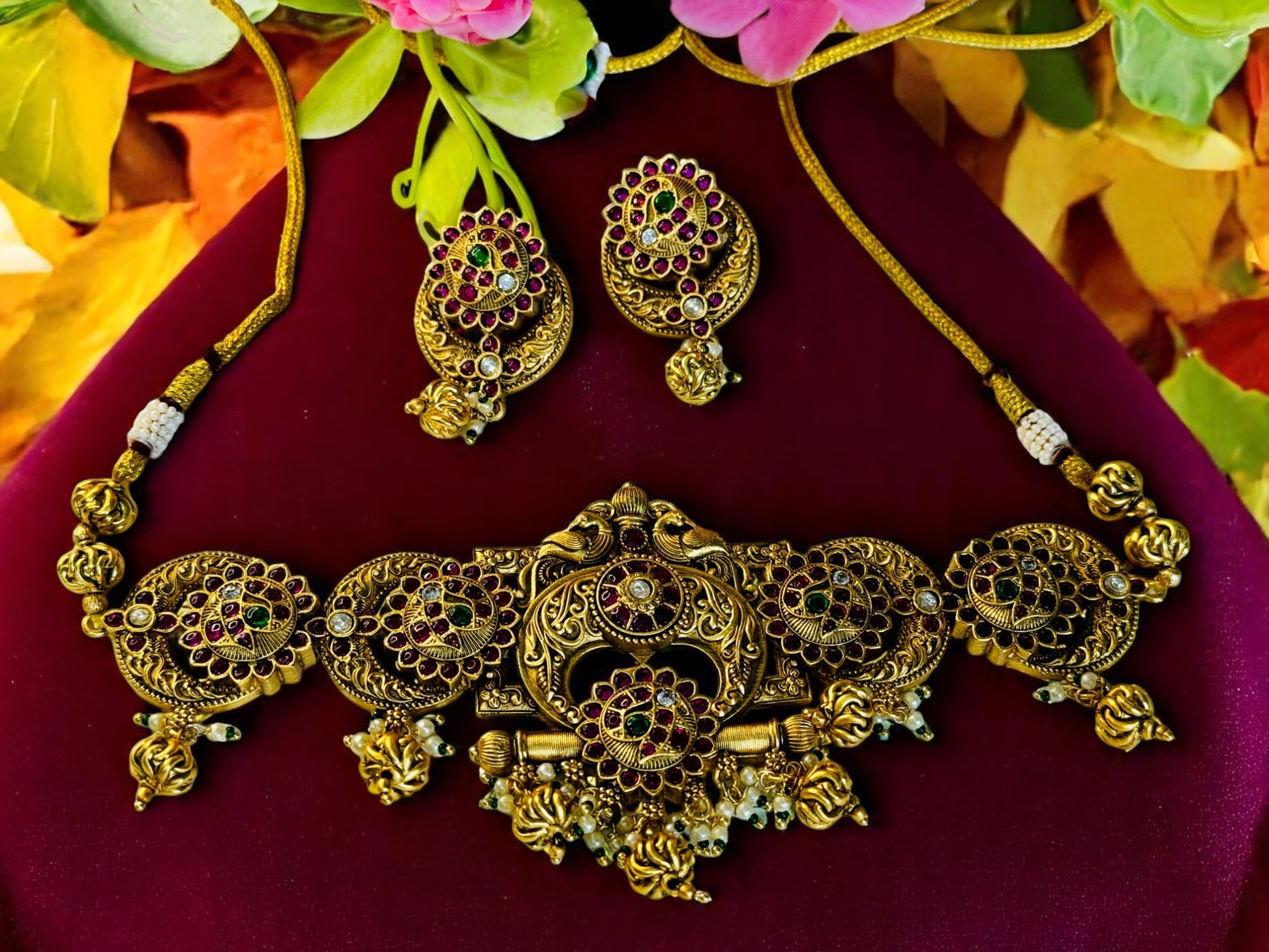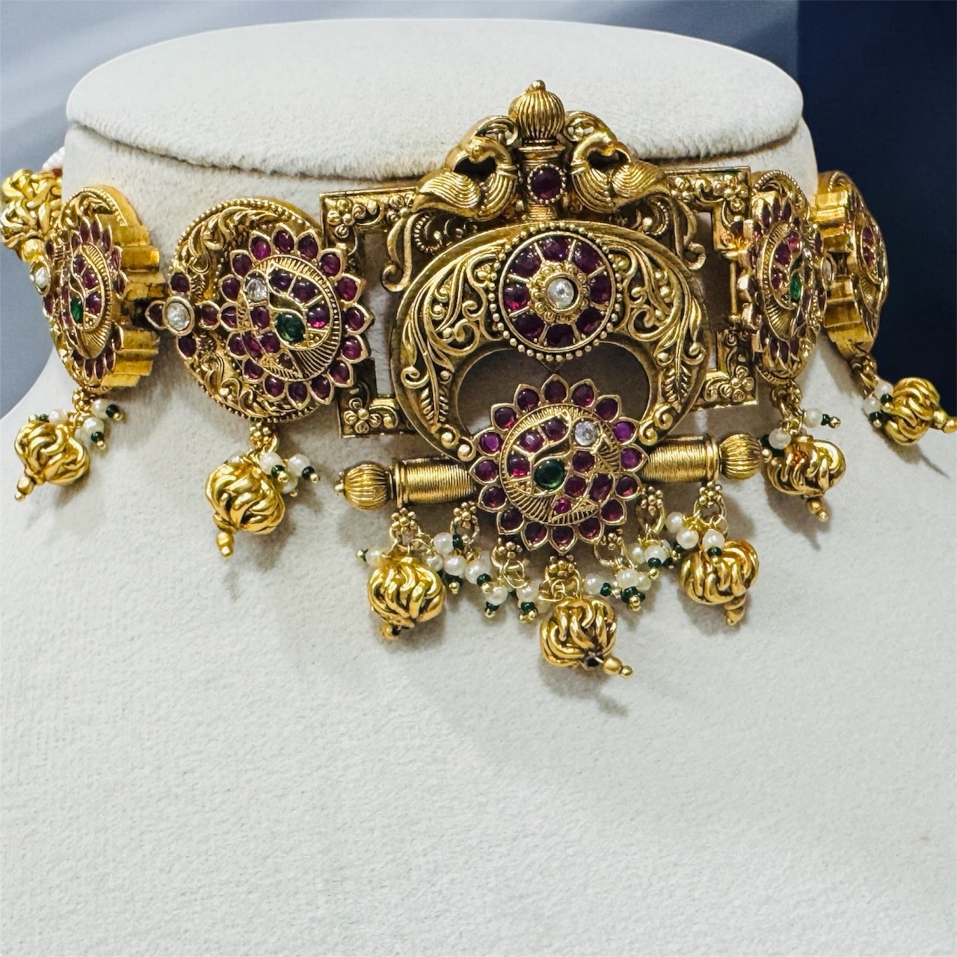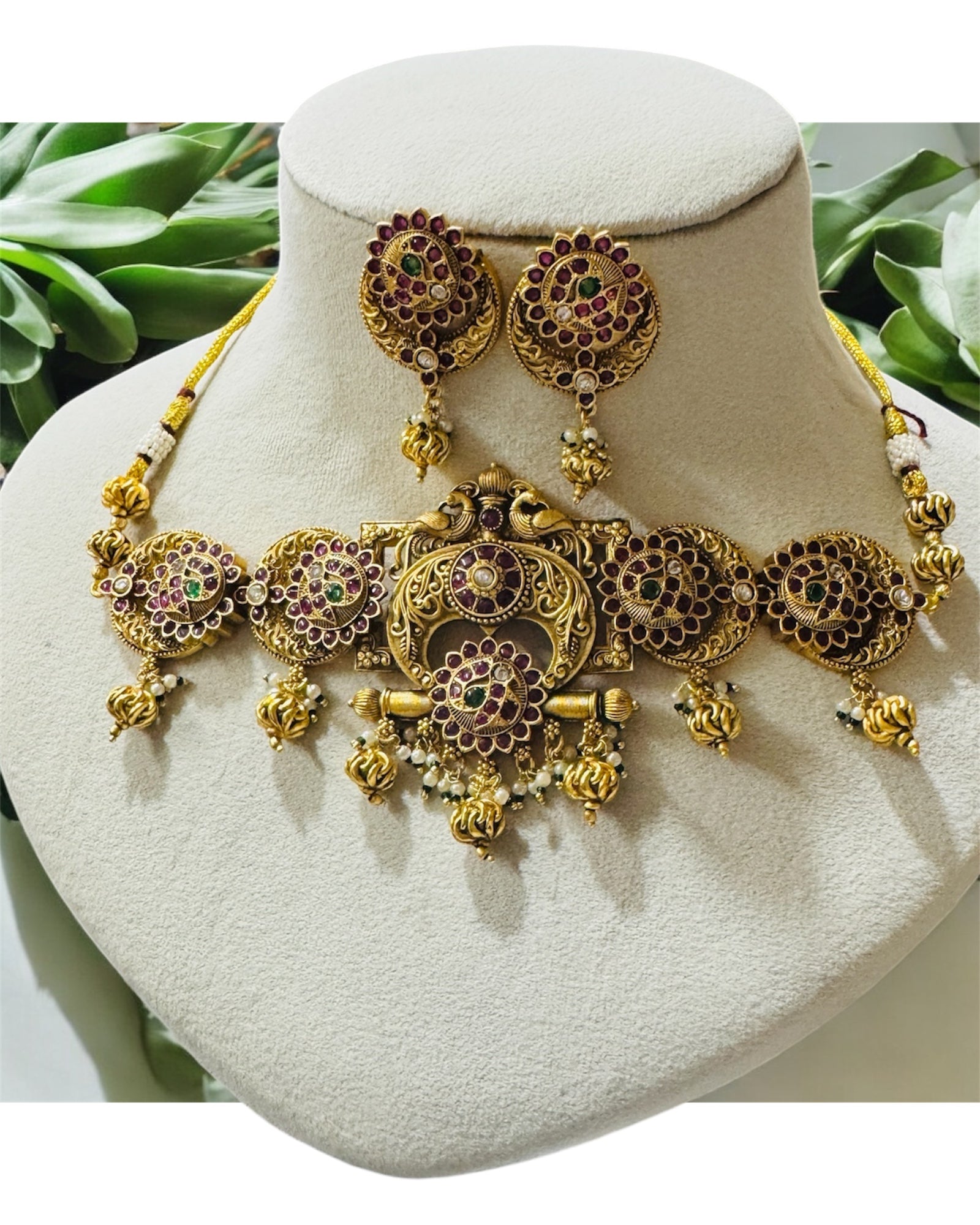 Box Contains – Beautiful Choker Antique Neckpiece designed beautifully with hanging gold drops and red stones along pair of earrings.