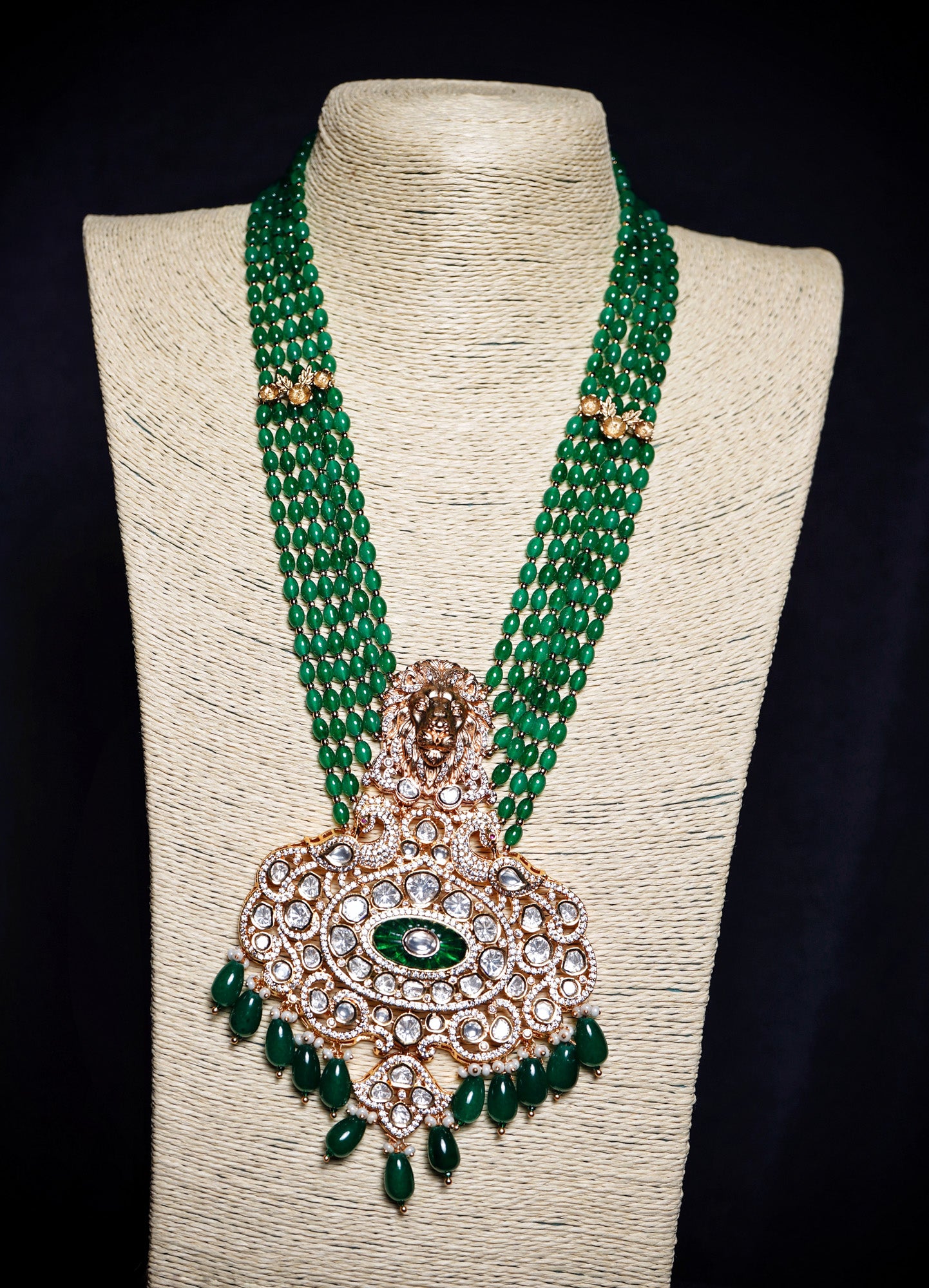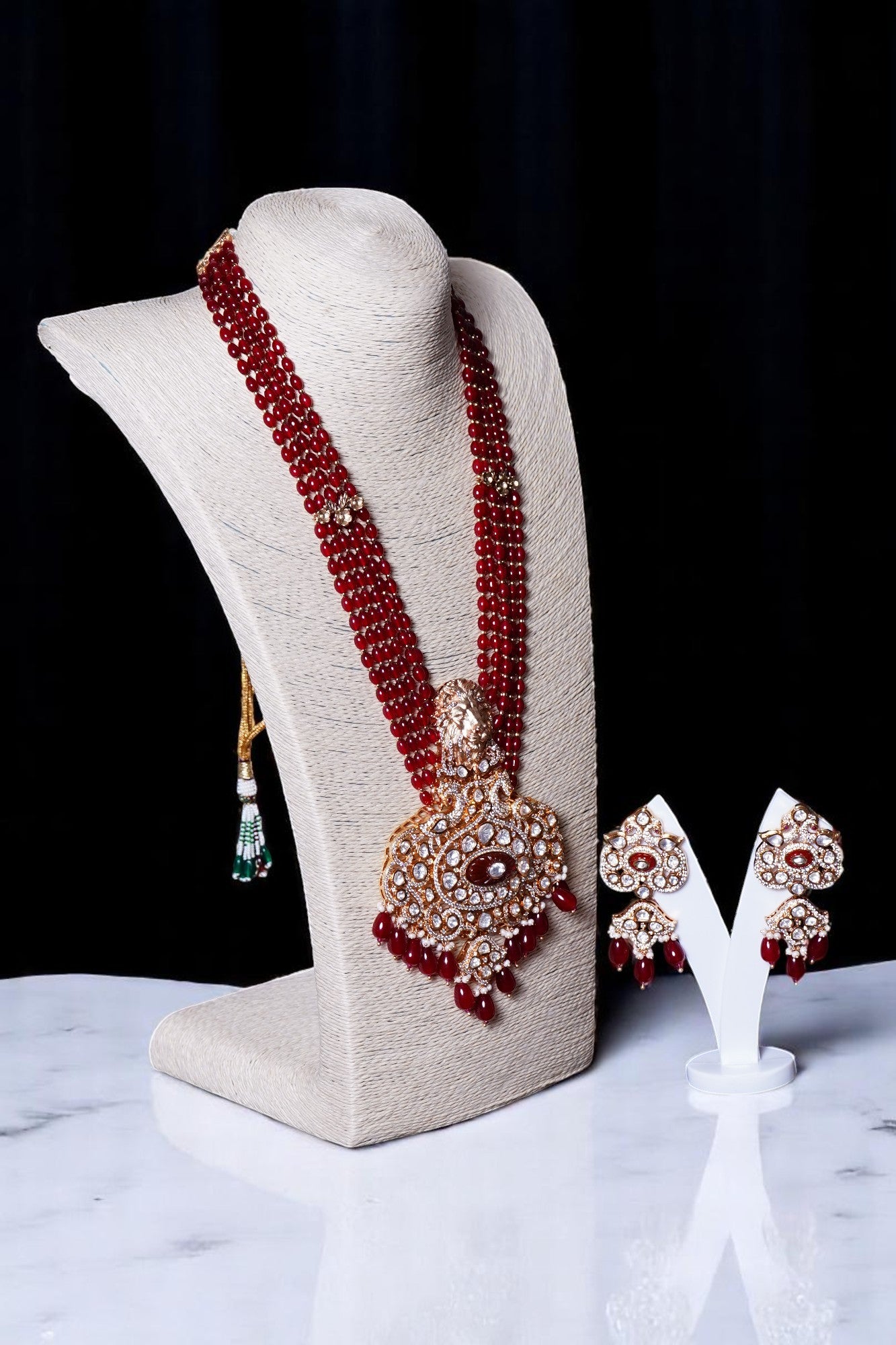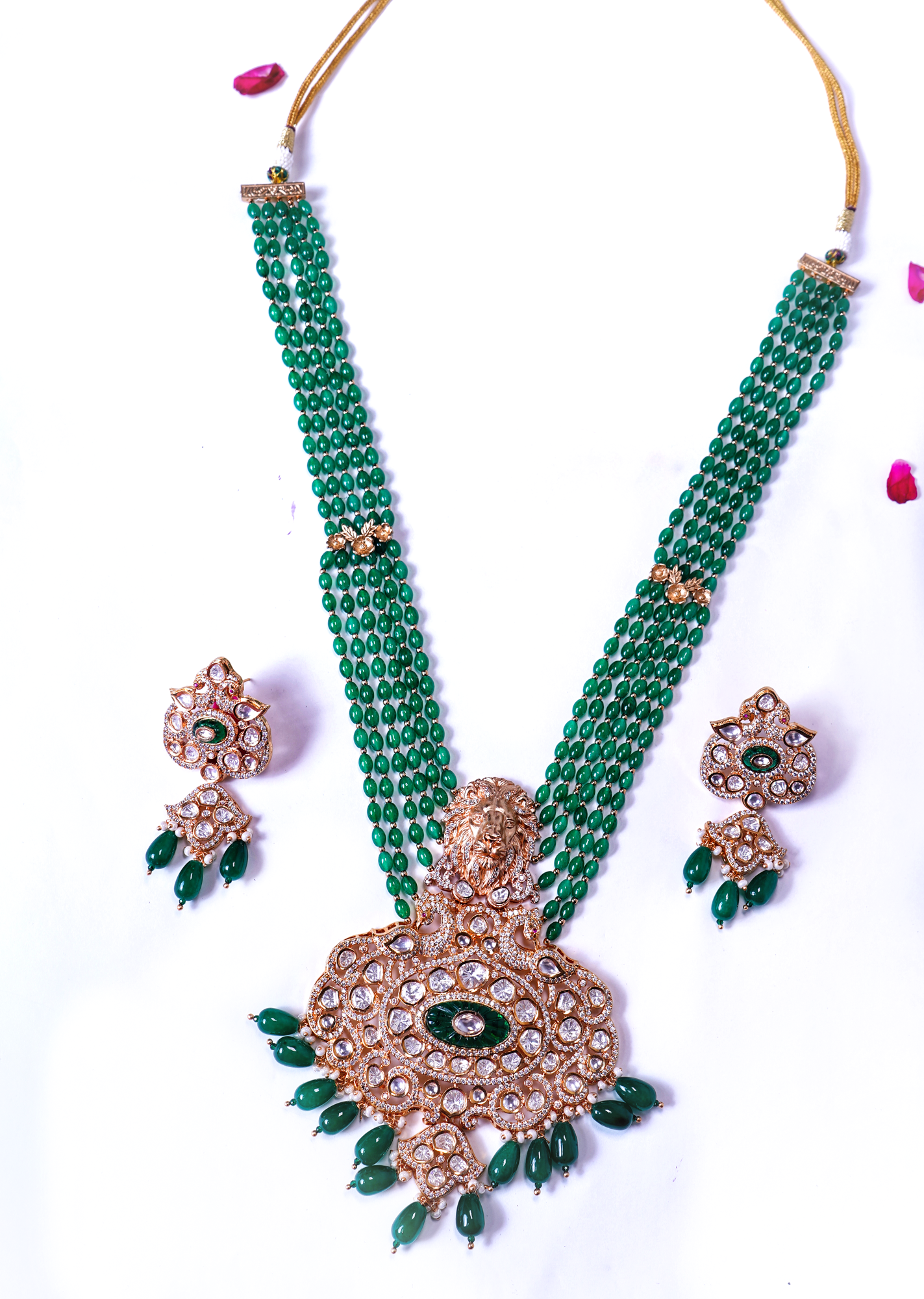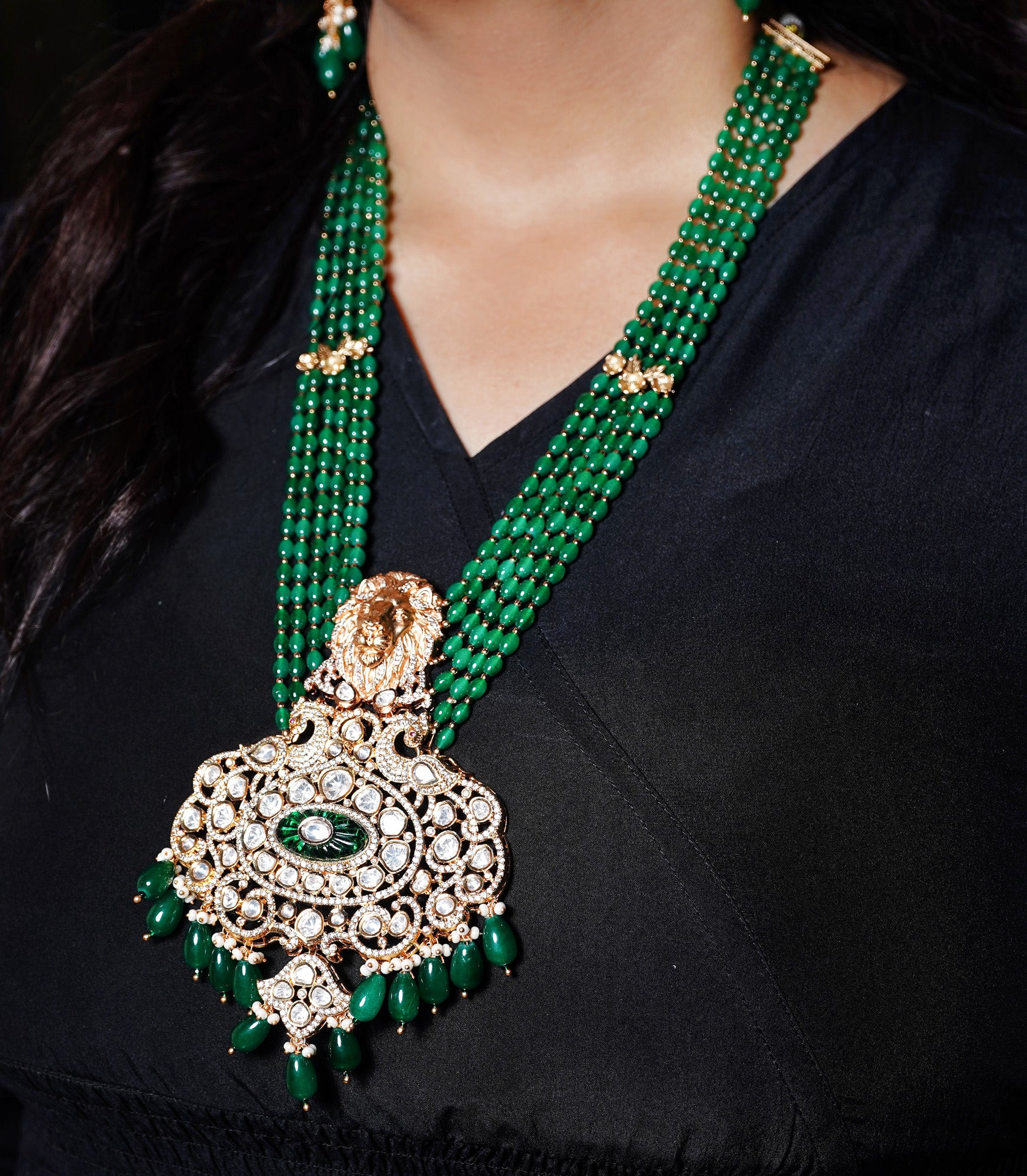 Box Contains – Beautiful Long coloured stone studded Polki designer neckpiece with lion-figured along with designer pair of earrings