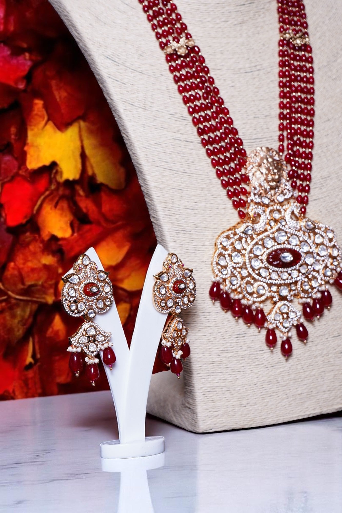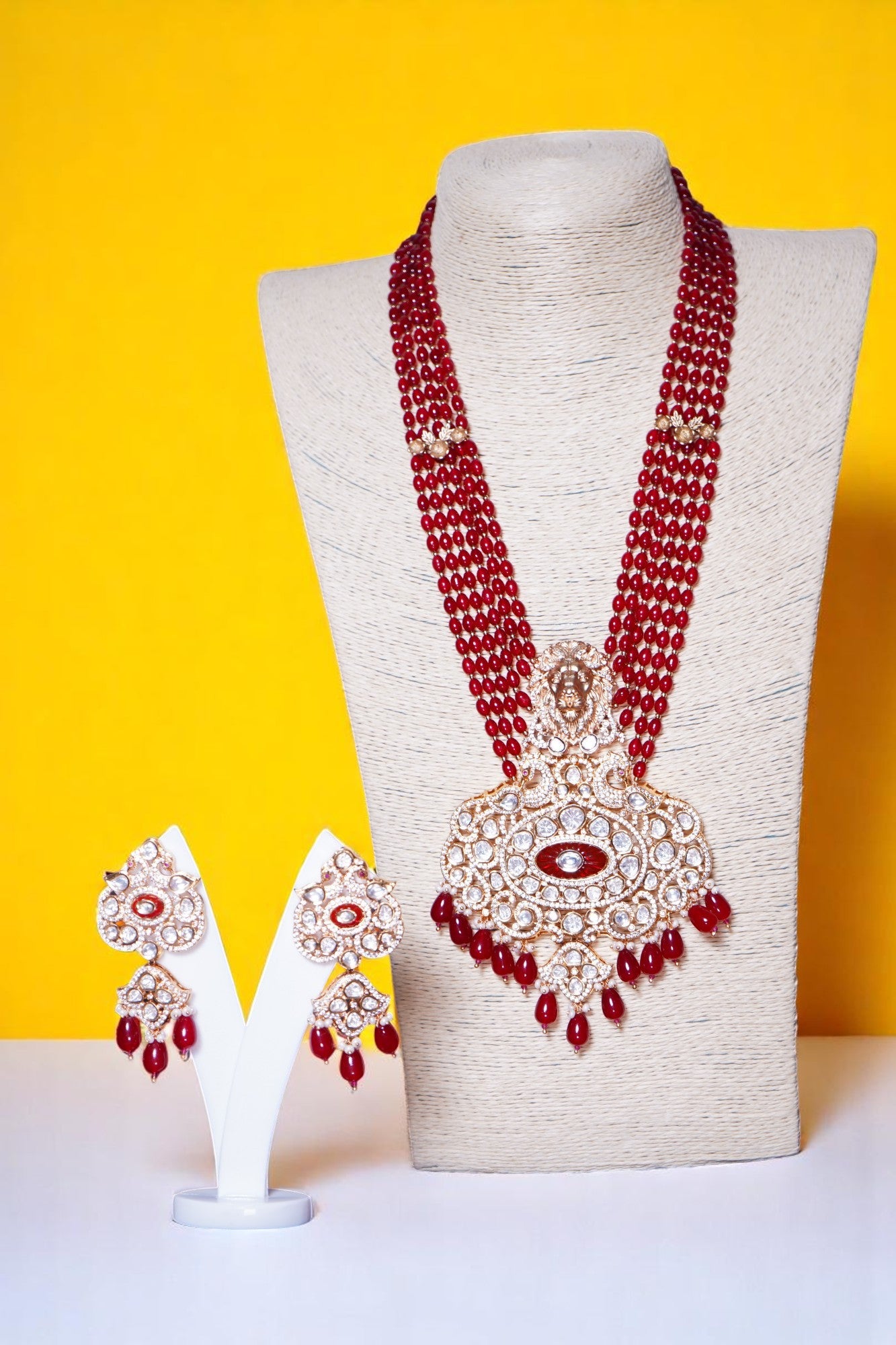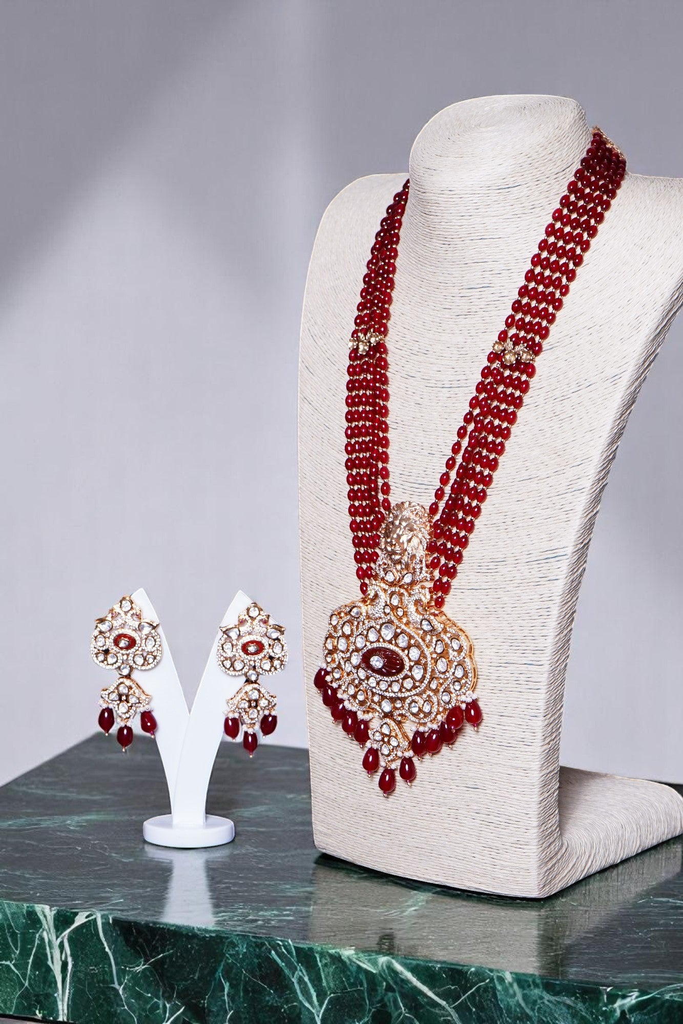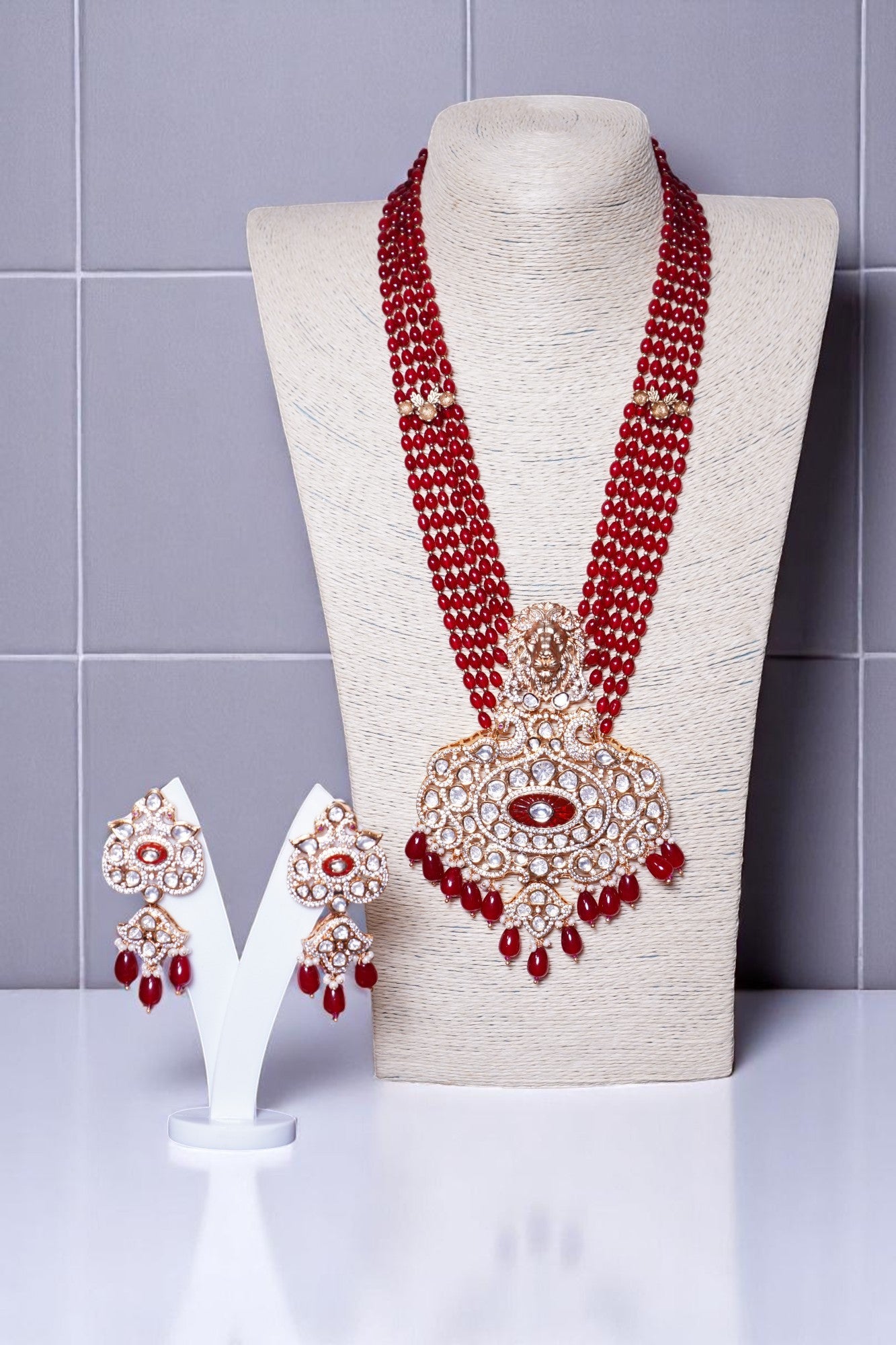 Box Contains – Beautiful Long coloured stone studded Polki designer neckpiece with lion-figured along with designer pair of earrings