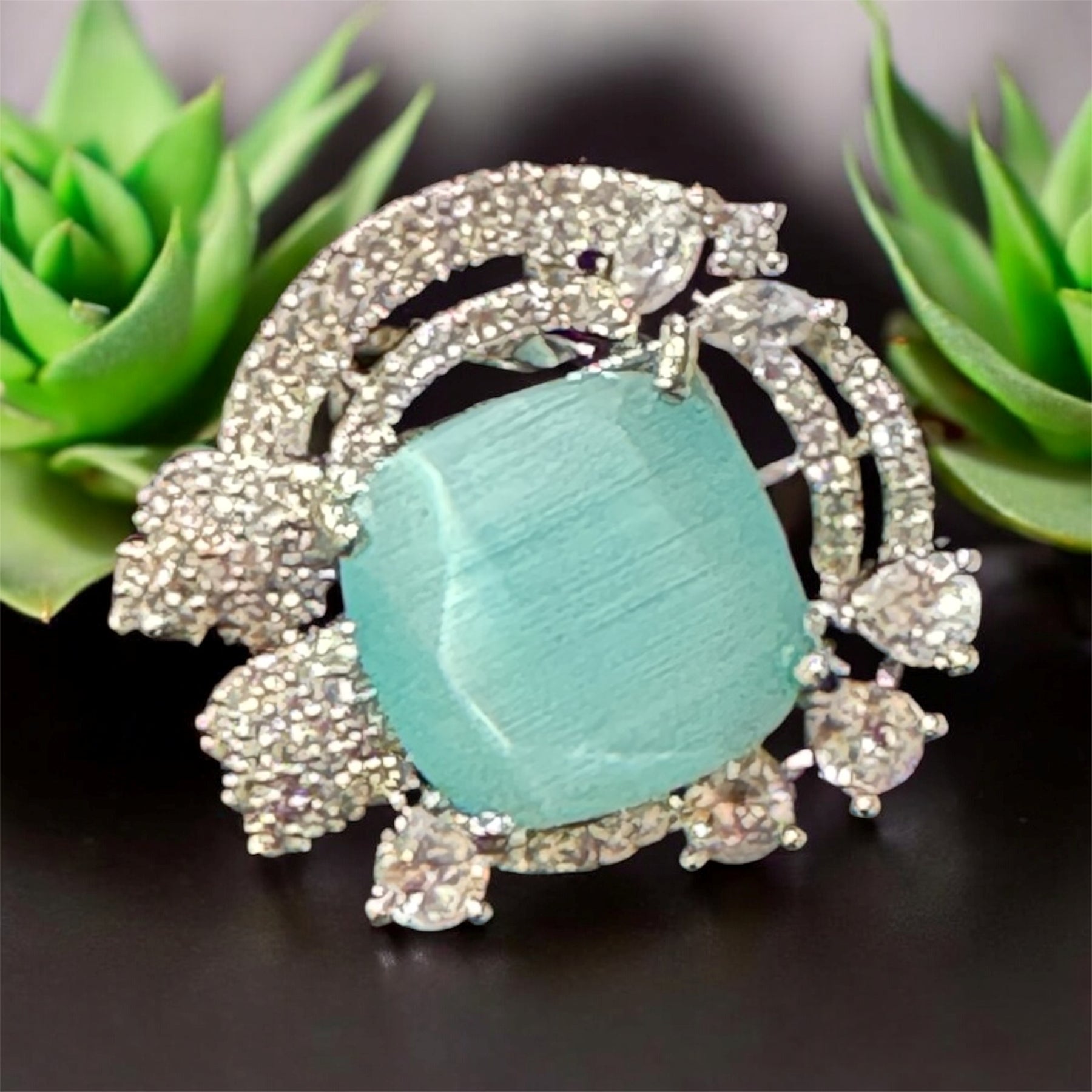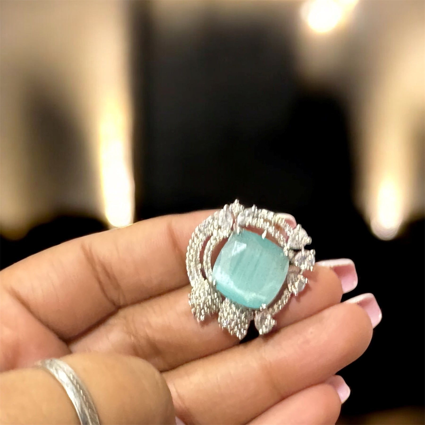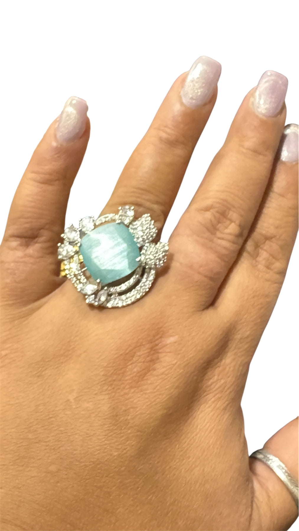 Box Contains – Beautiful designer Cocktail ring Studded with Turquoise green coloured stone and Diamond stones making this ring a Royal Elegance