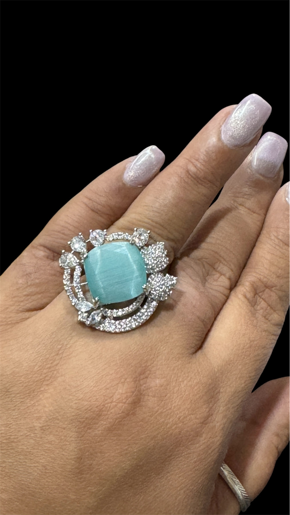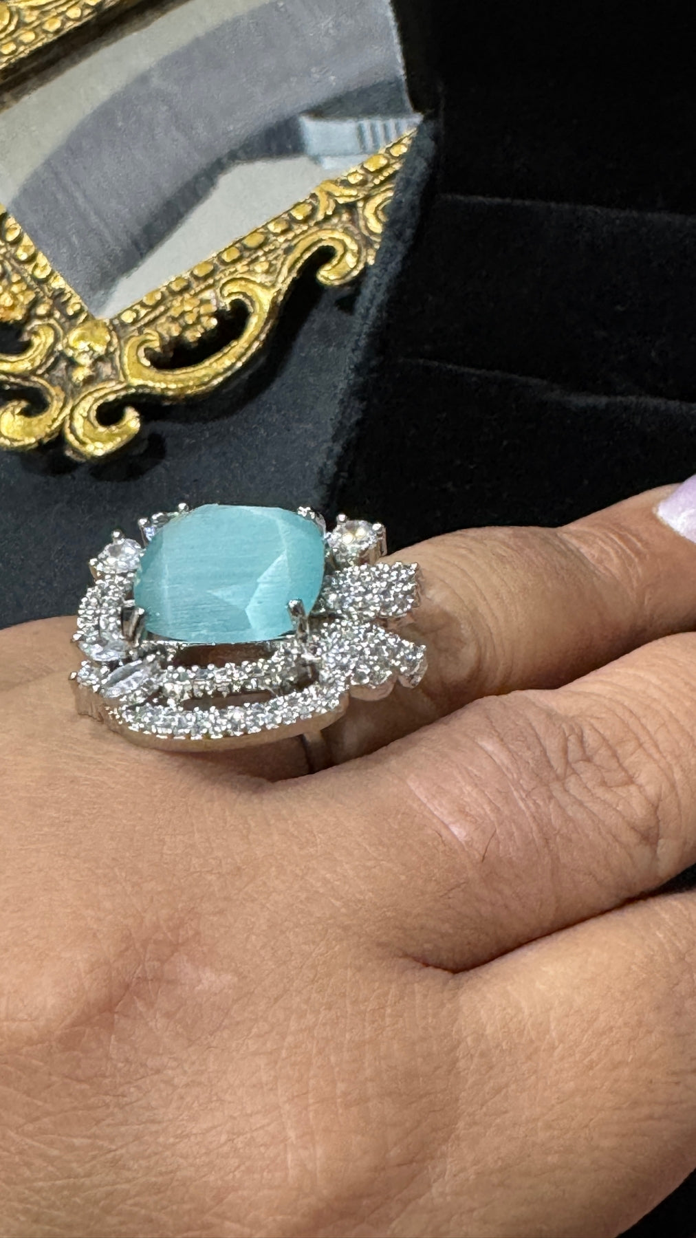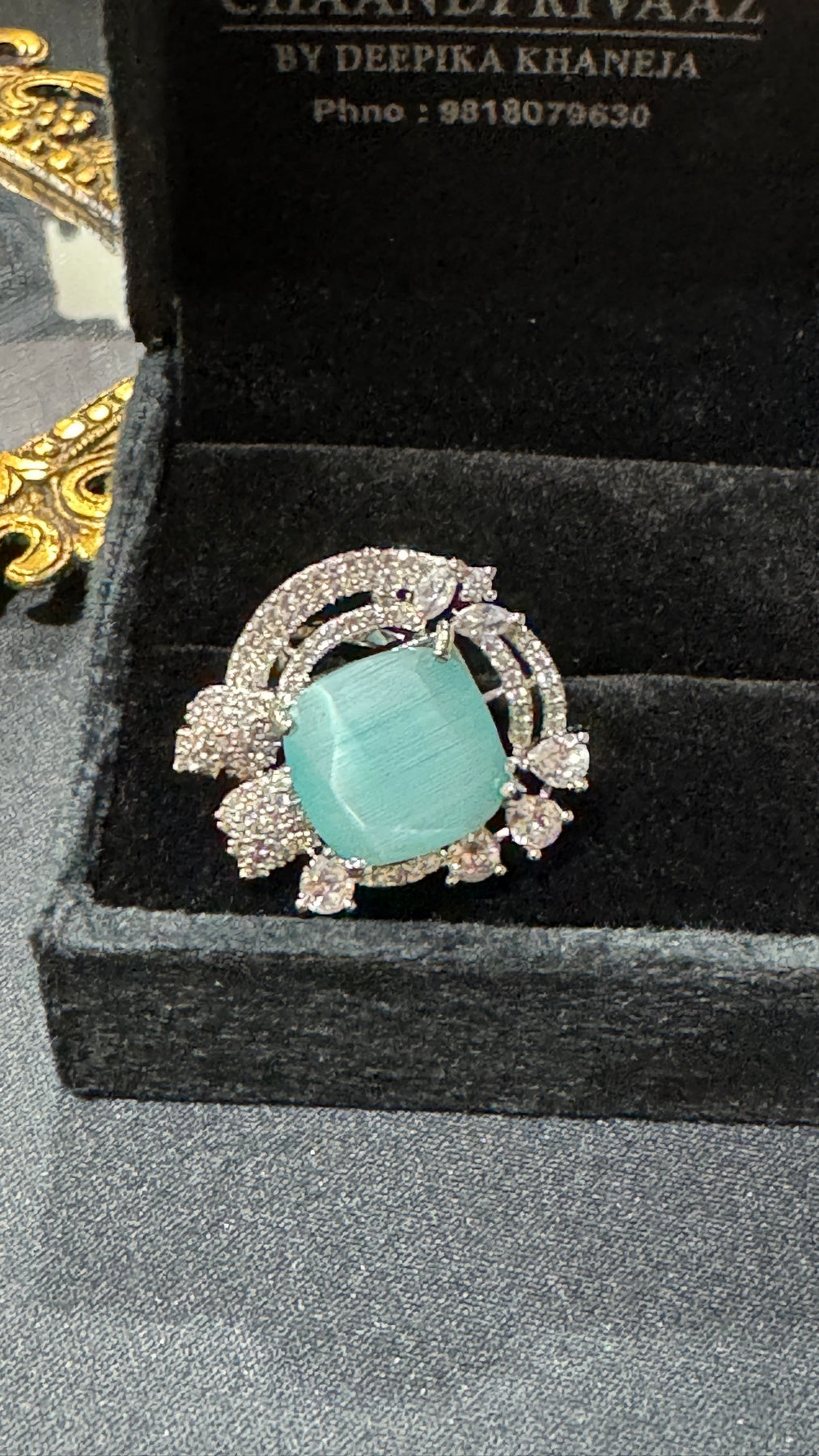 Box Contains – Beautiful designer Cocktail ring Studded with Turquoise green coloured stone and Diamond stones making this ring a Royal Elegance