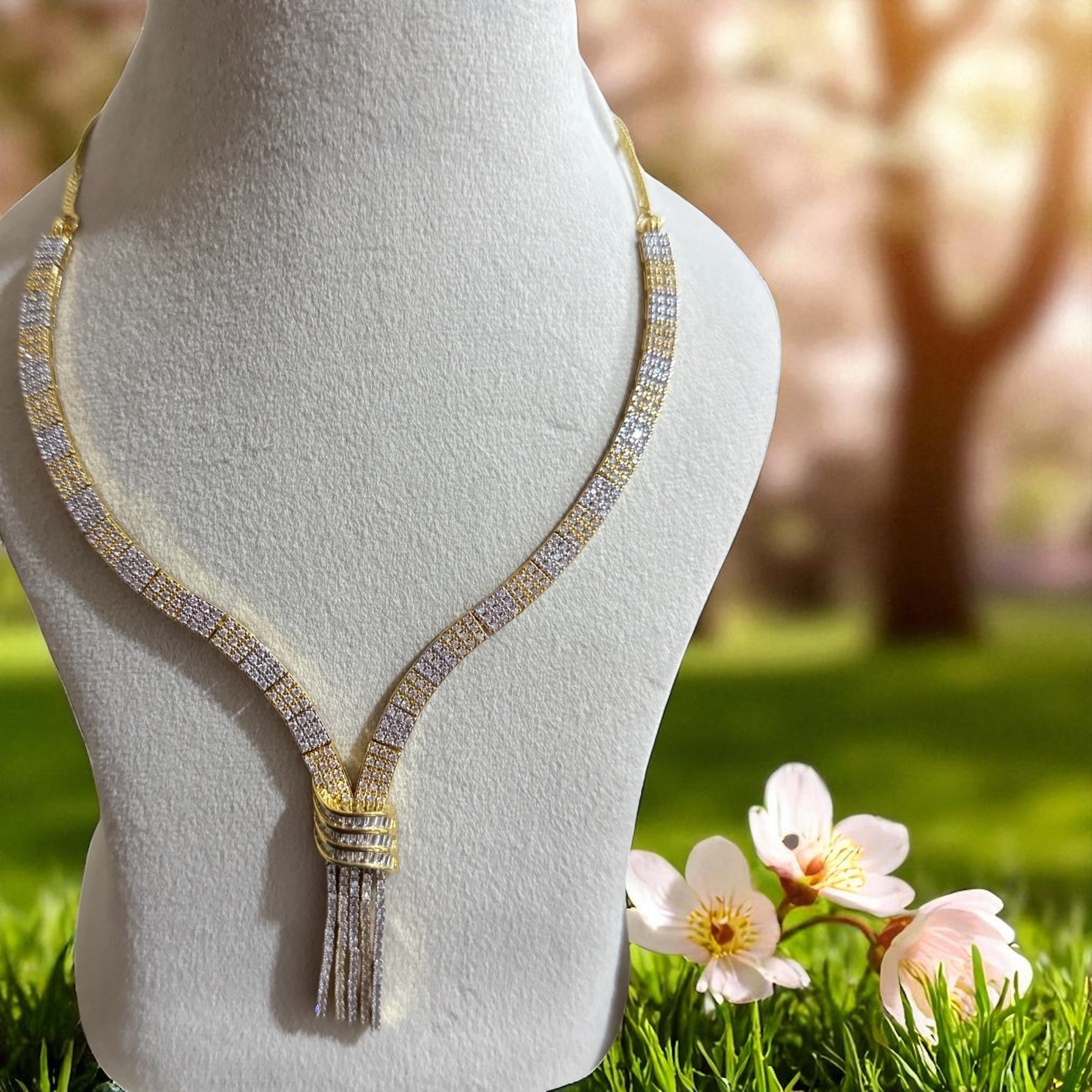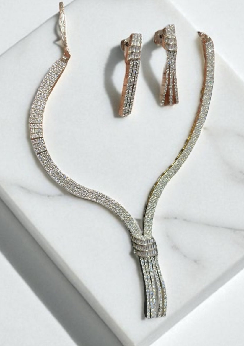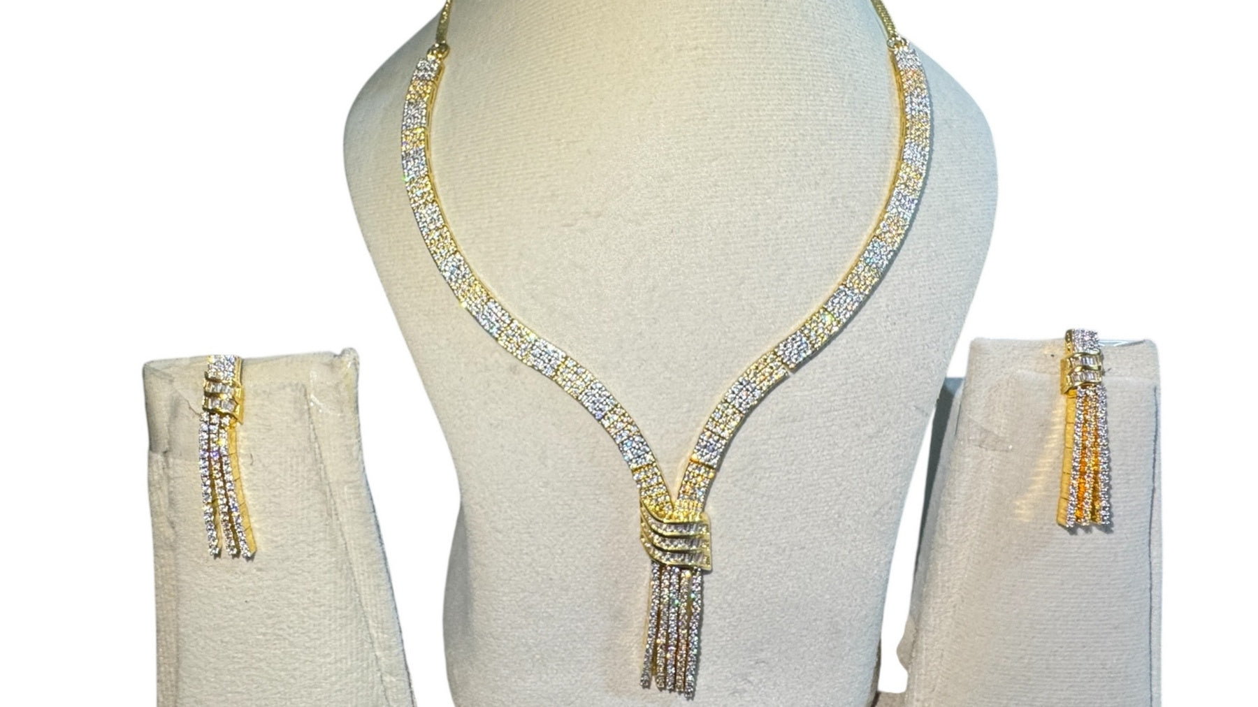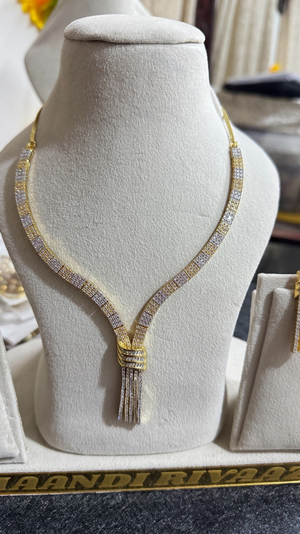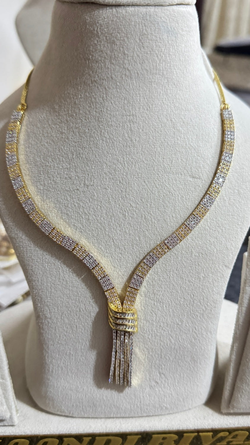 Box Contains – Unveil a breathtaking diamond look alike, V- Shaped elegant designer necklace set along with a beautiful pair of same earrings