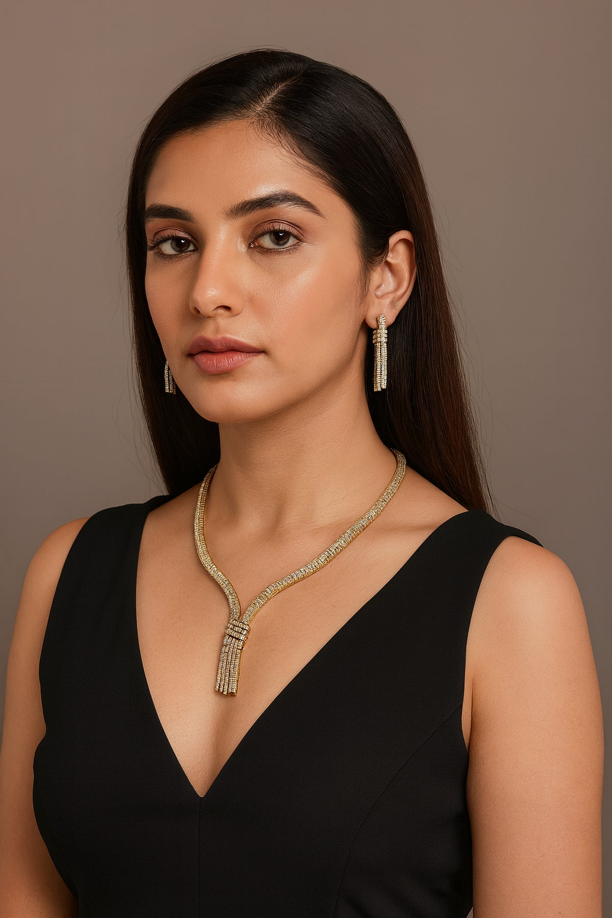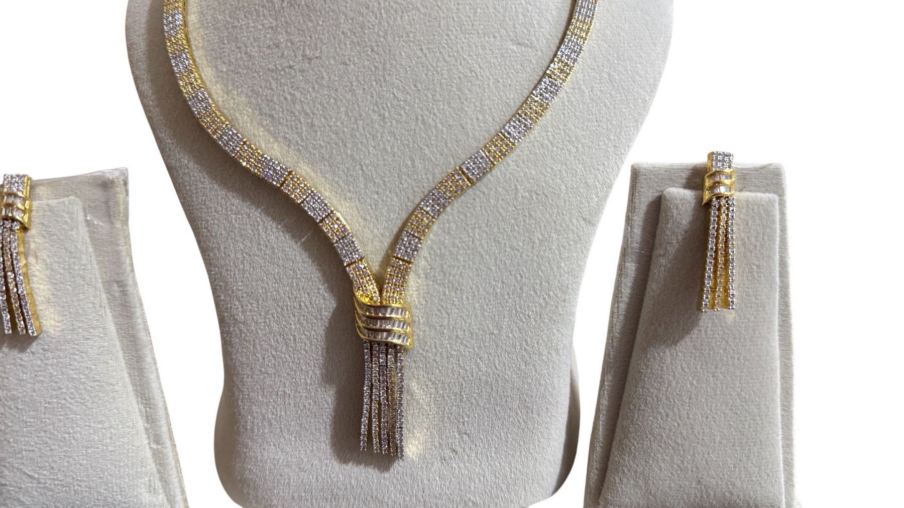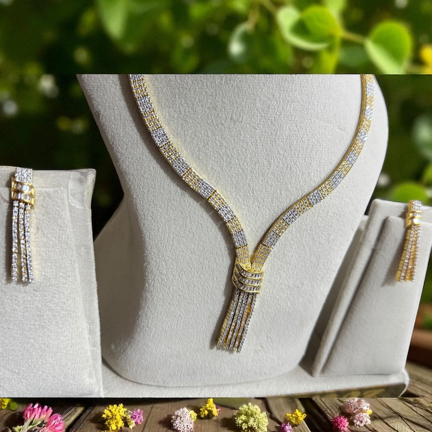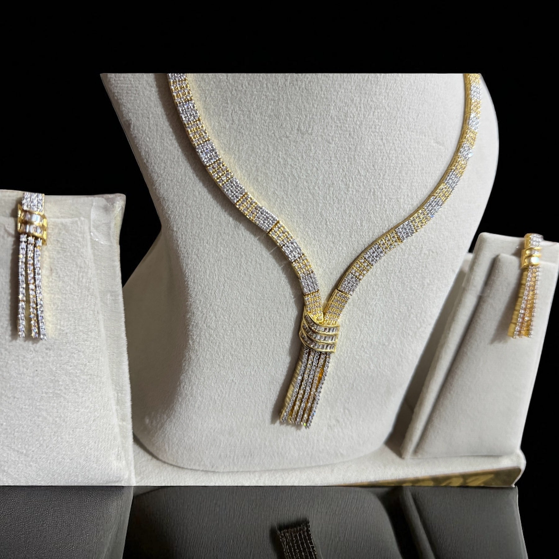 Box Contains – Unveil a breathtaking diamond look alike, V- Shaped elegant designer necklace set along with a beautiful pair of same earrings