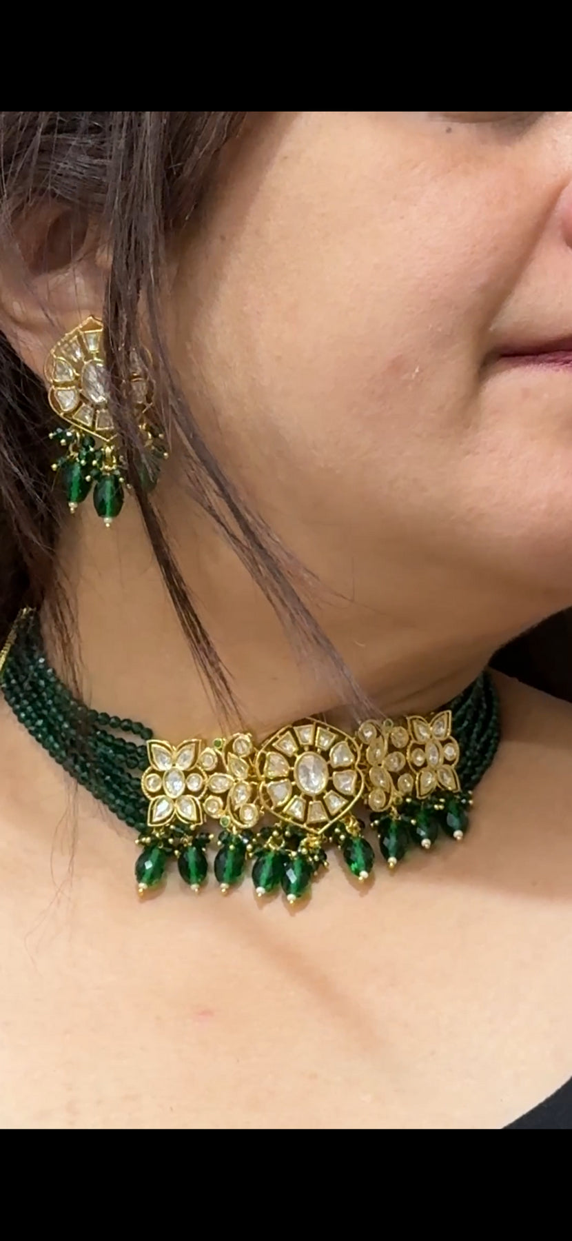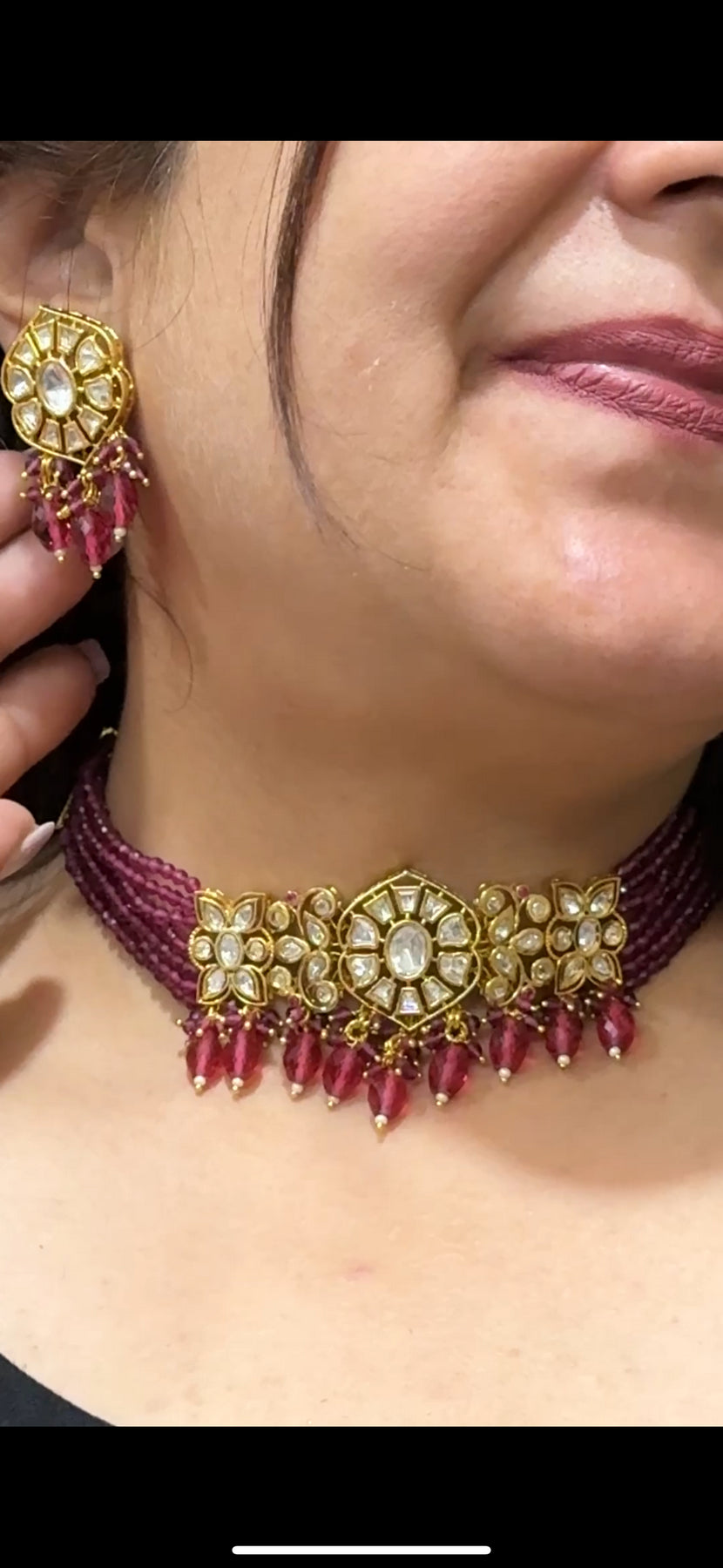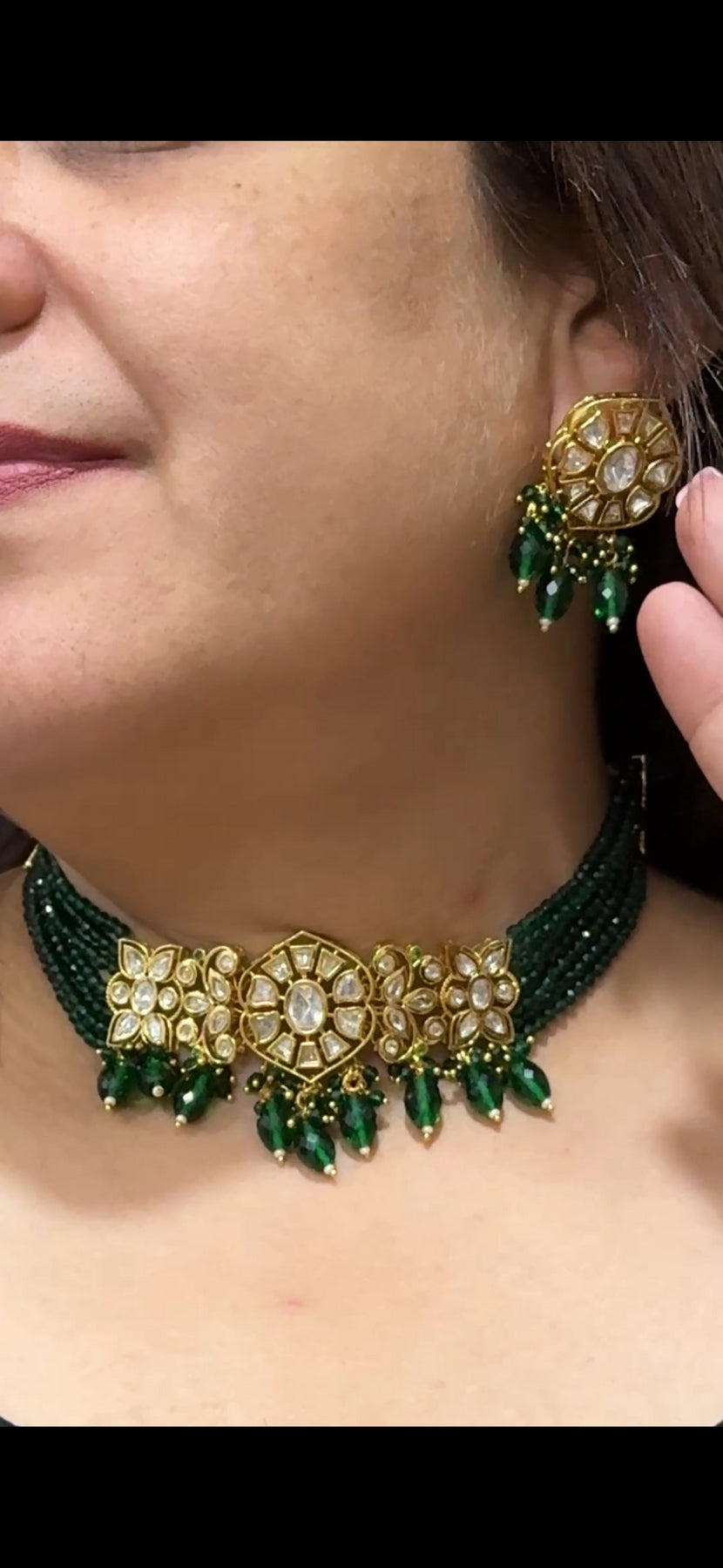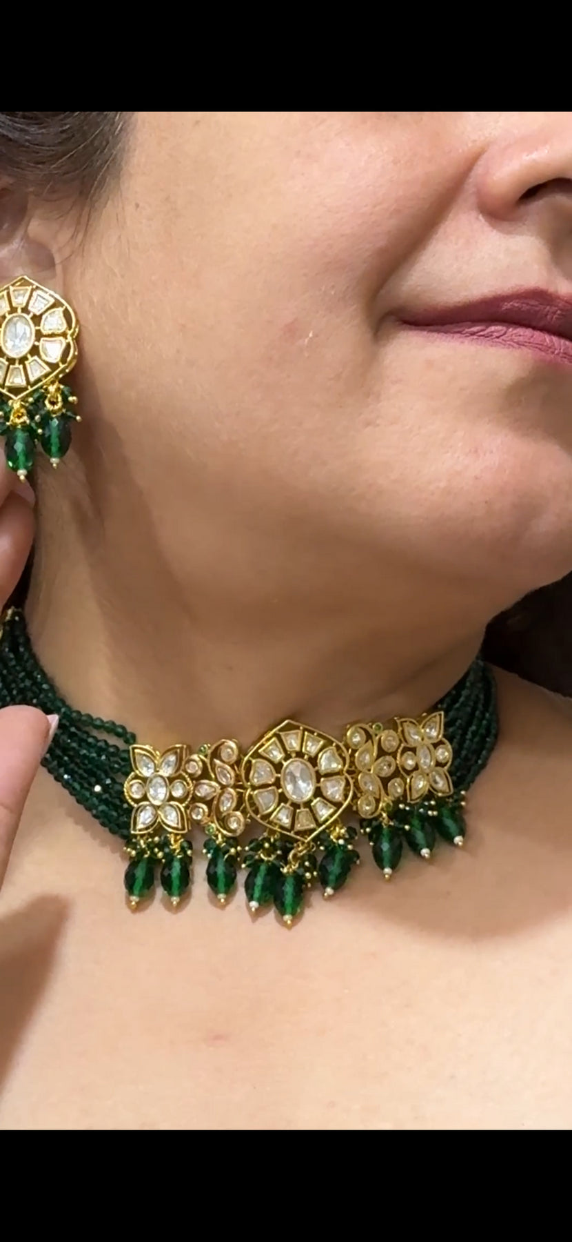 Box Contains – Beautiful Coloured Stones Neckpiece attached to same coloured beads mala chain and hanging drops with pair of beautiful Earrings making it a Royal Elegance
