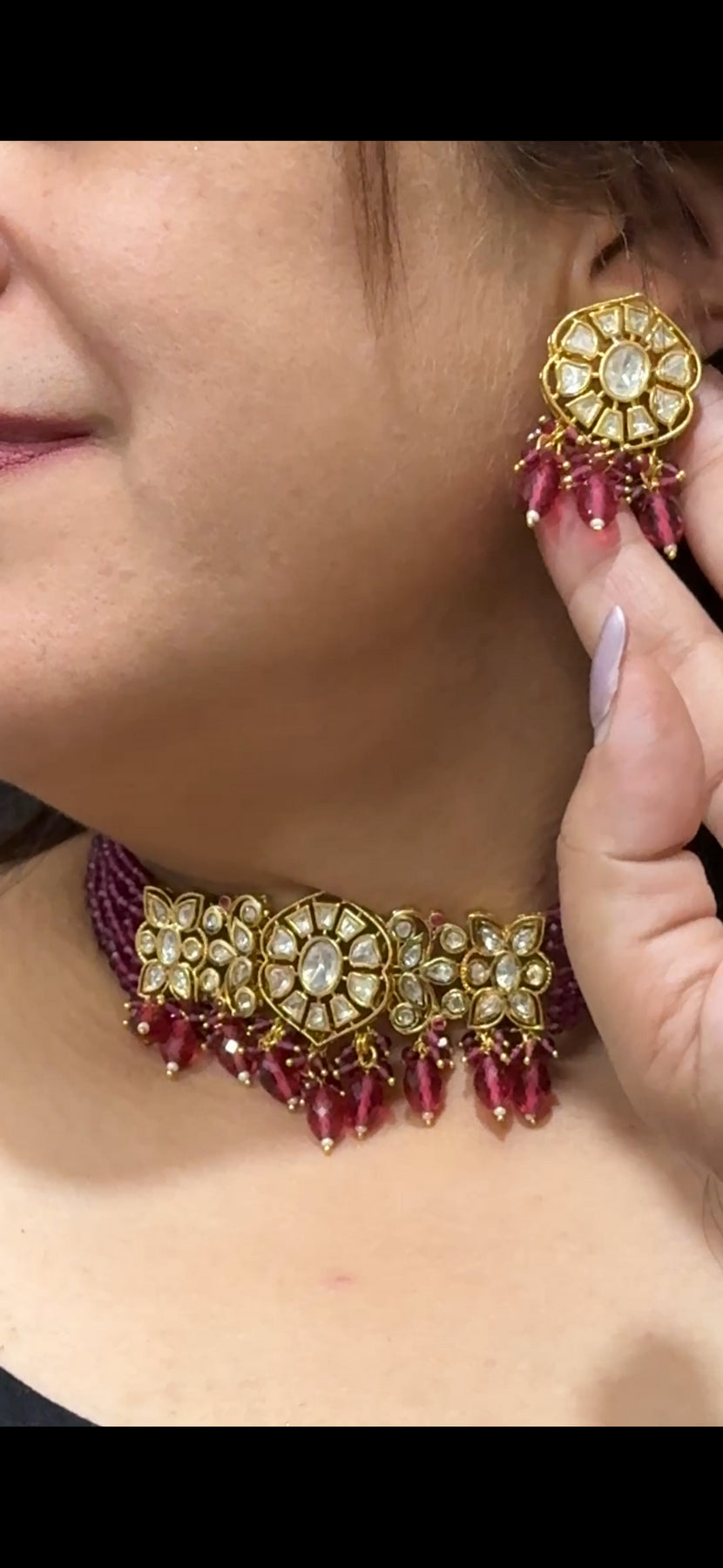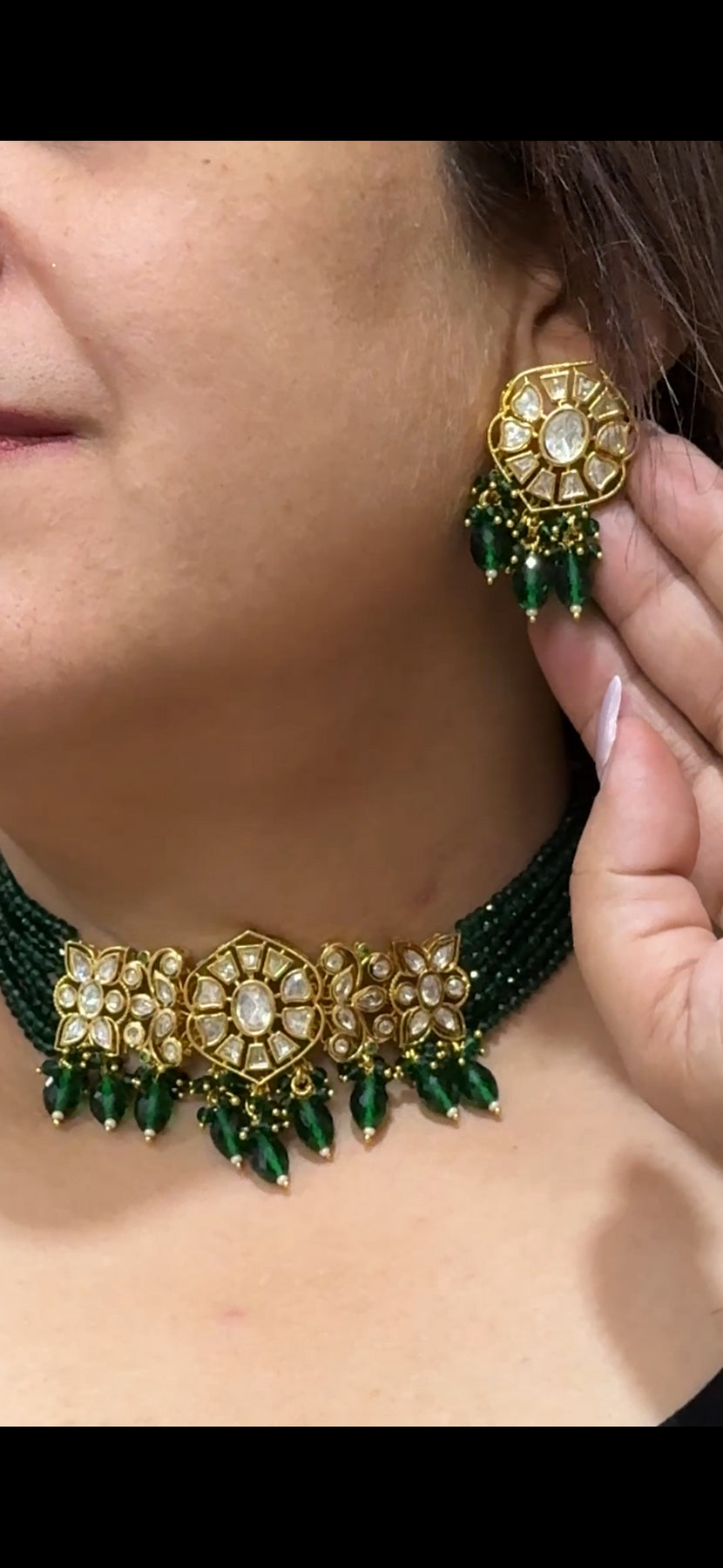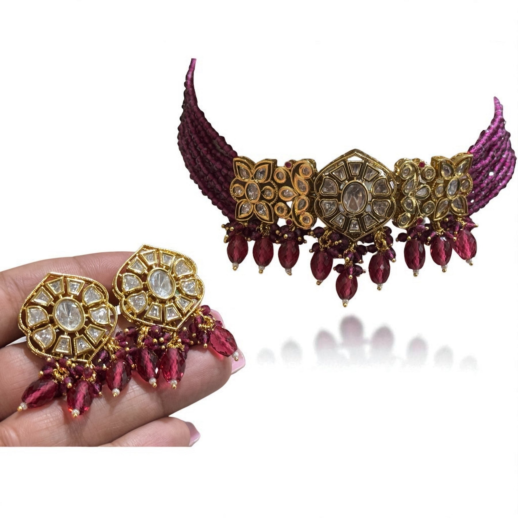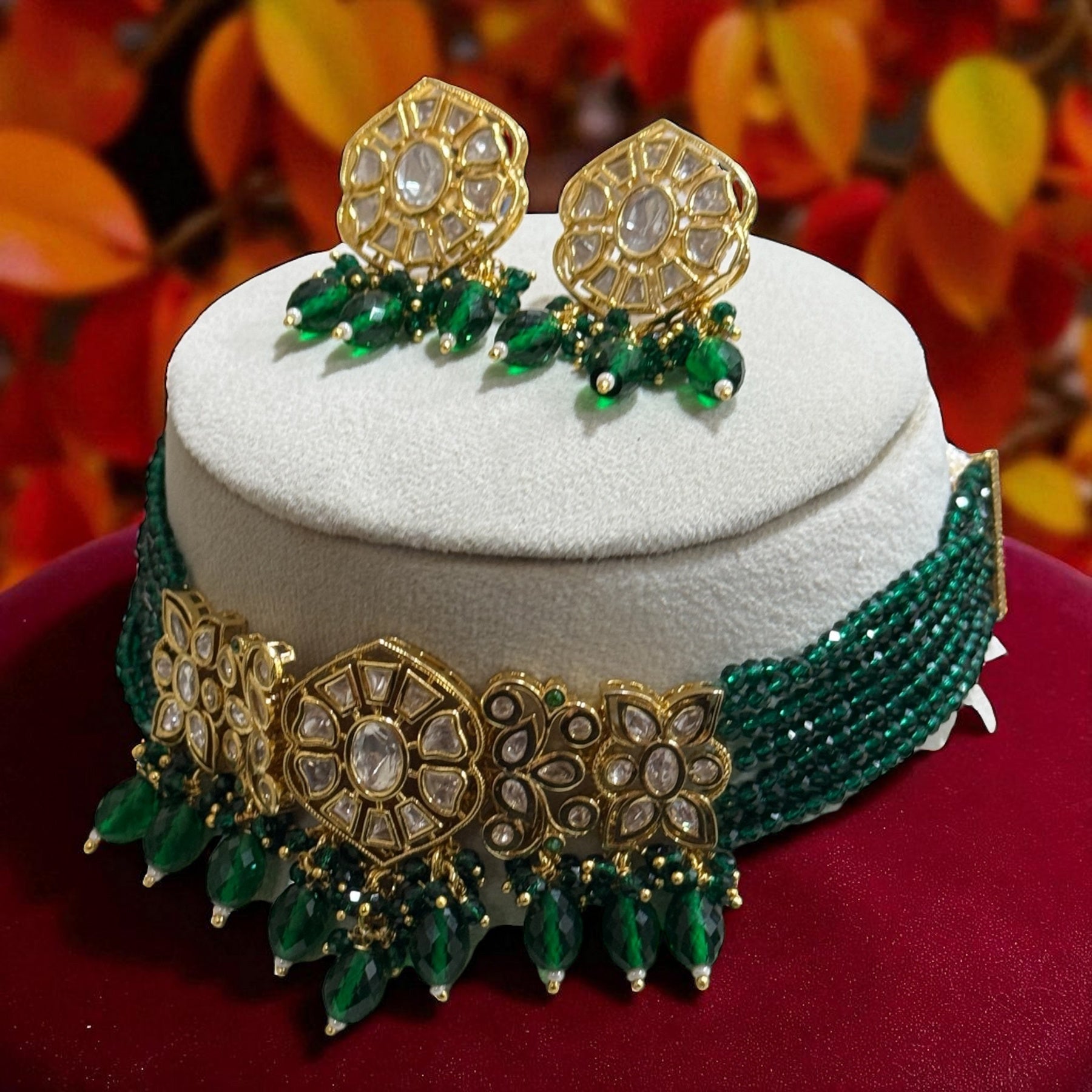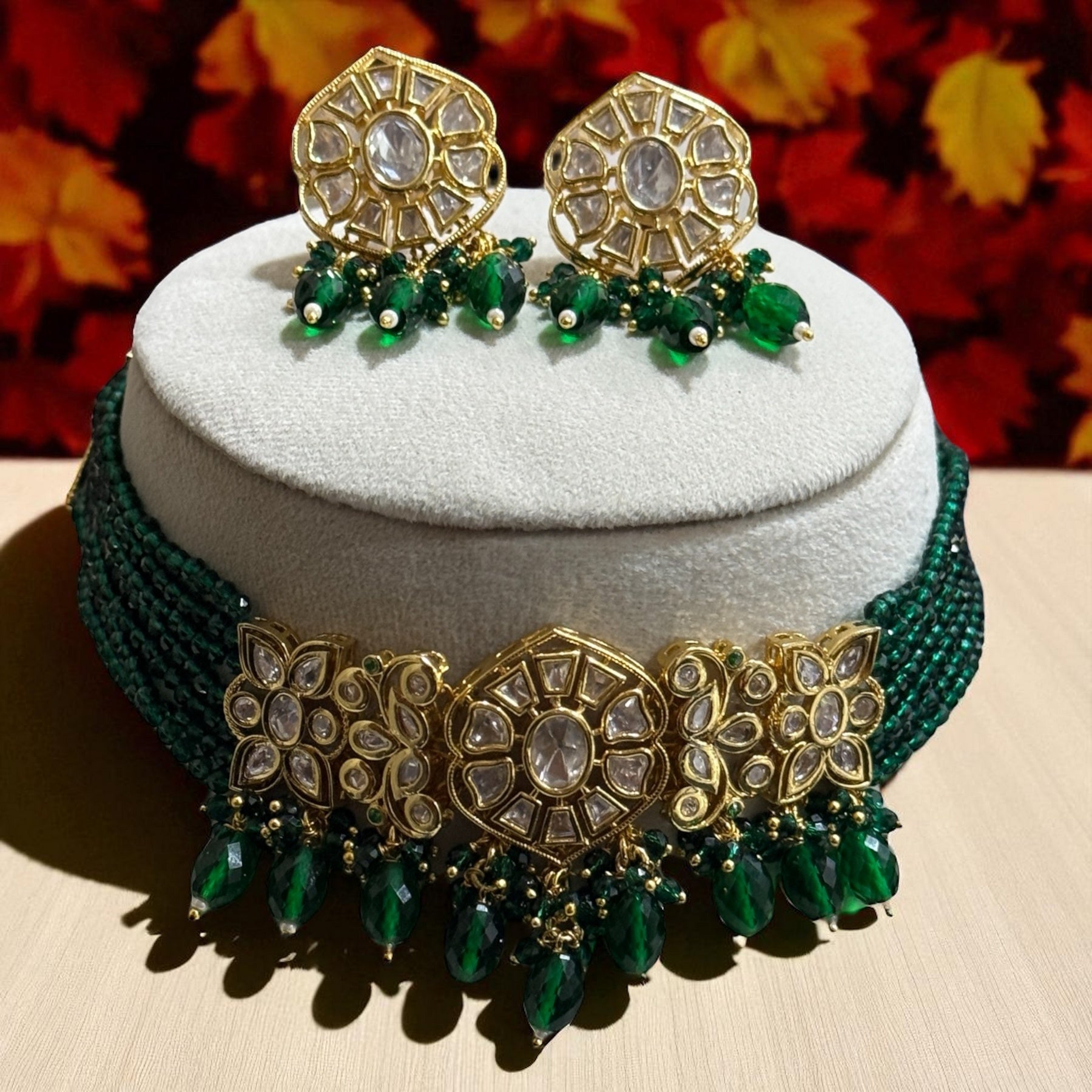 Box Contains – Beautiful Coloured Stones Neckpiece attached to same coloured beads mala chain and hanging drops with pair of beautiful Earrings making it a Royal Elegance