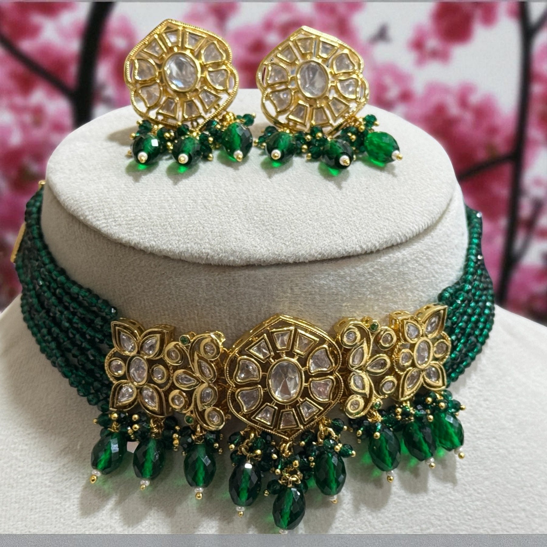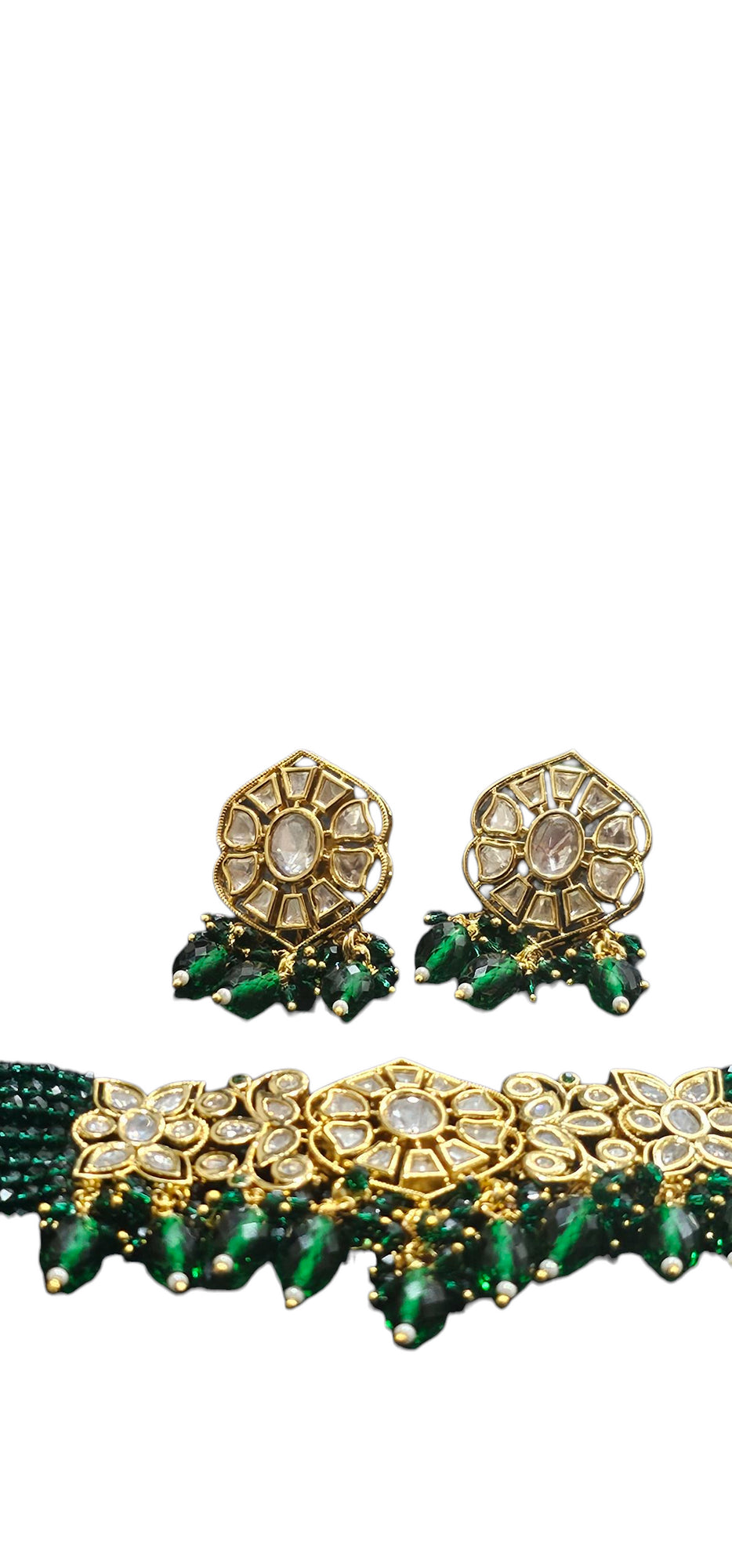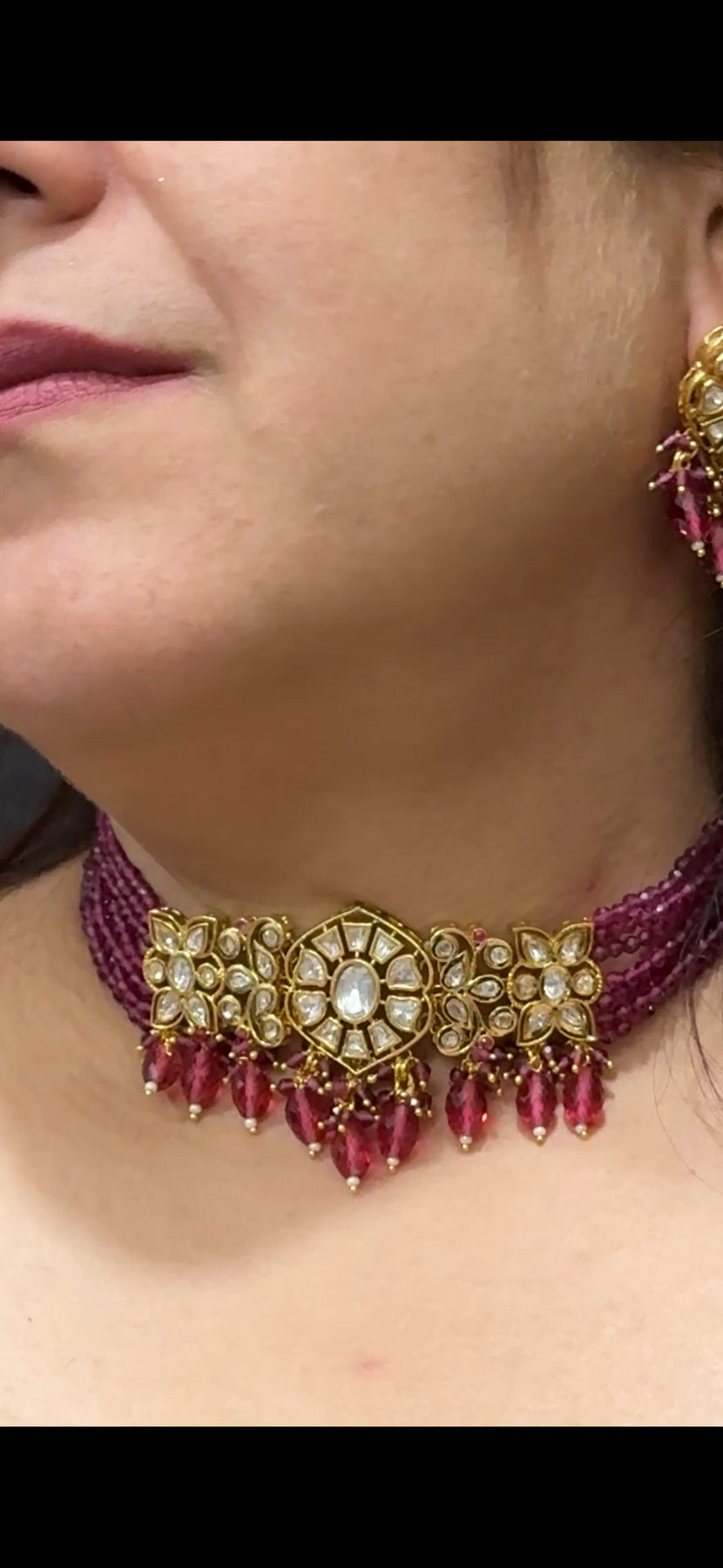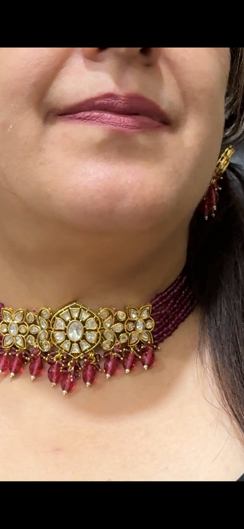 Box Contains – Beautiful Coloured Stones Neckpiece attached to same coloured beads mala chain and hanging drops with pair of beautiful Earrings making it a Royal Elegance