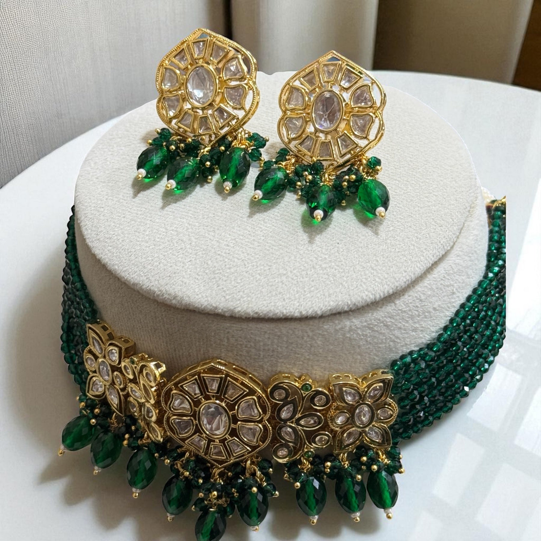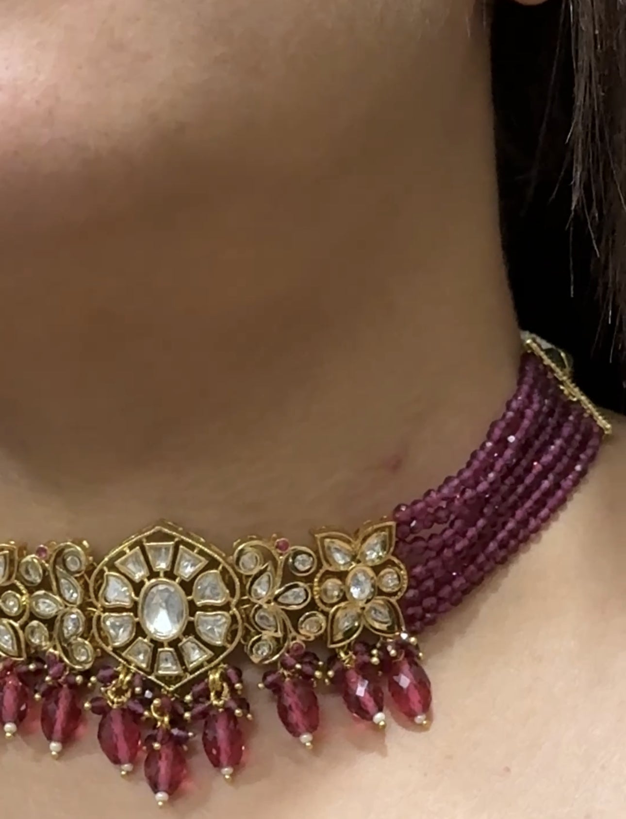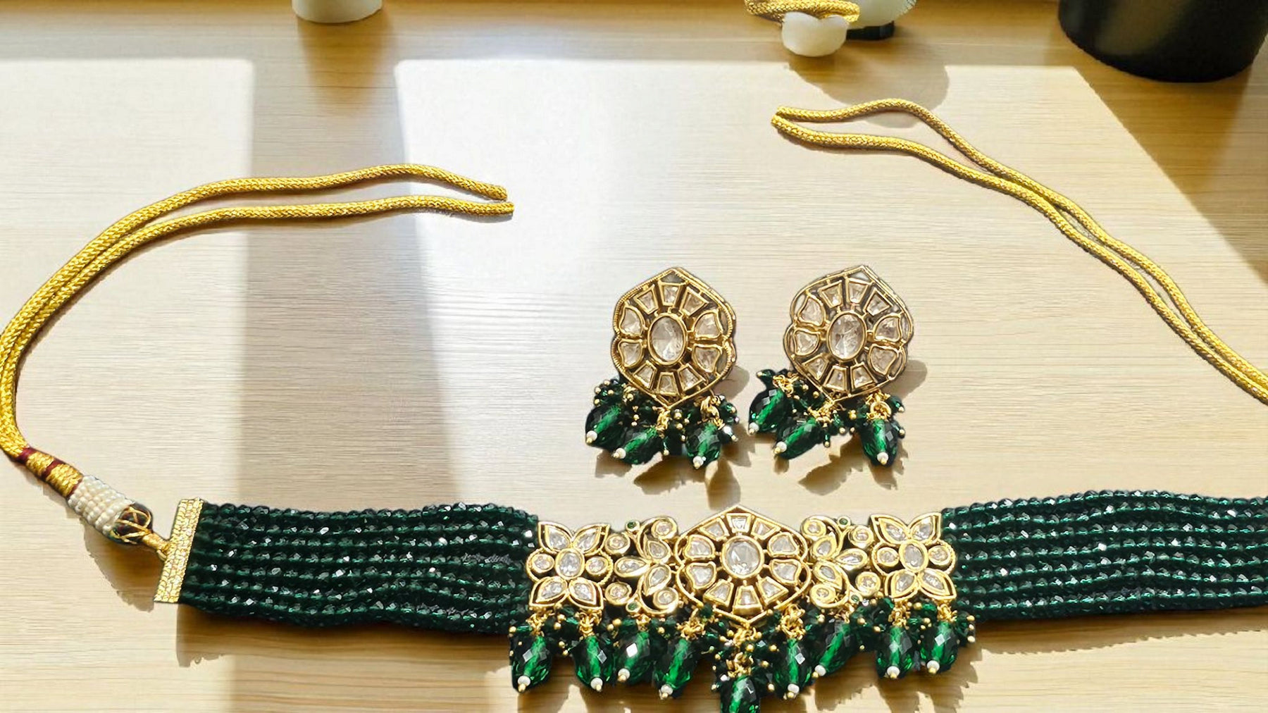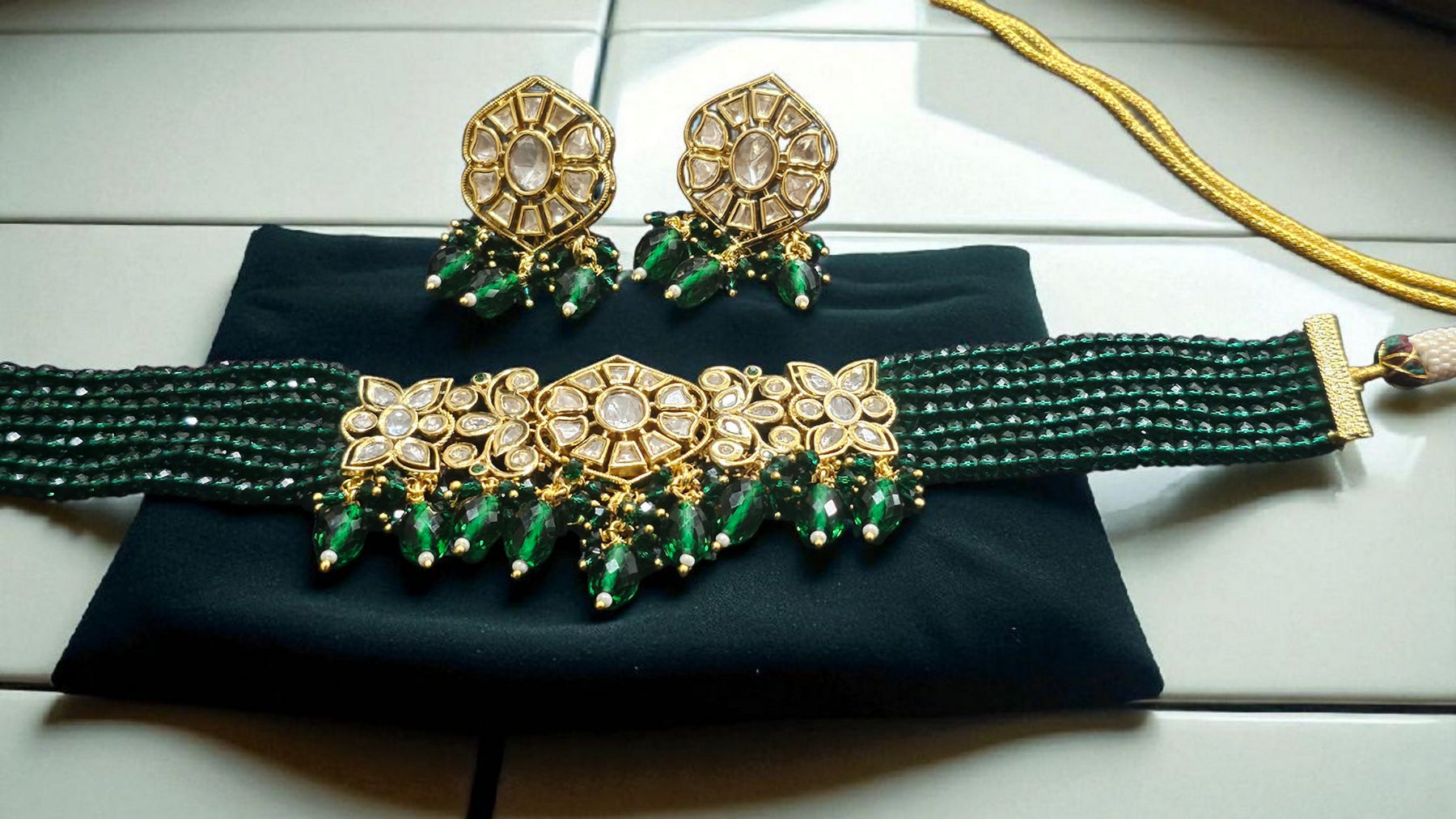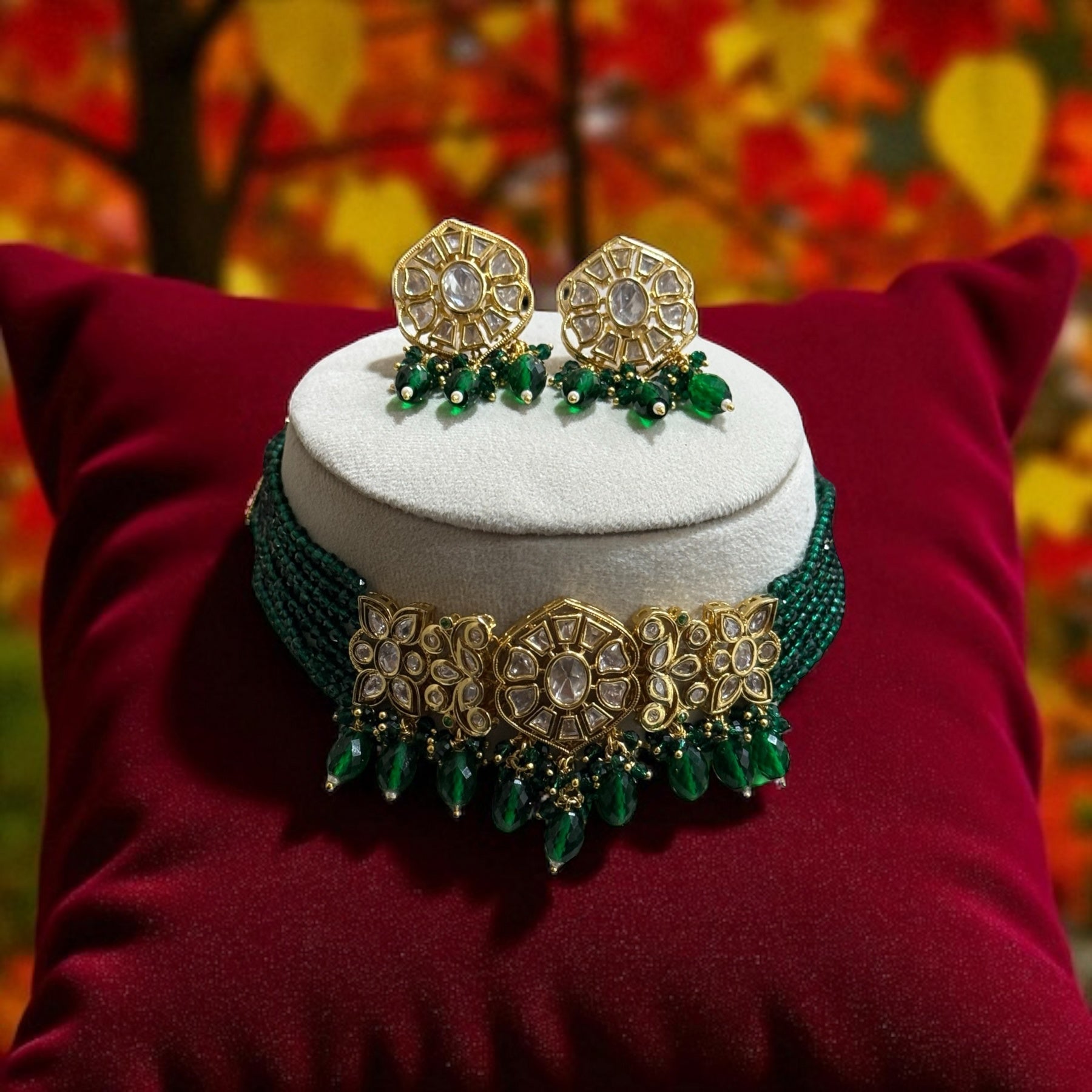 Box Contains – Beautiful Coloured Stones Neckpiece attached to same coloured beads mala chain and hanging drops with pair of beautiful Earrings making it a Royal Elegance