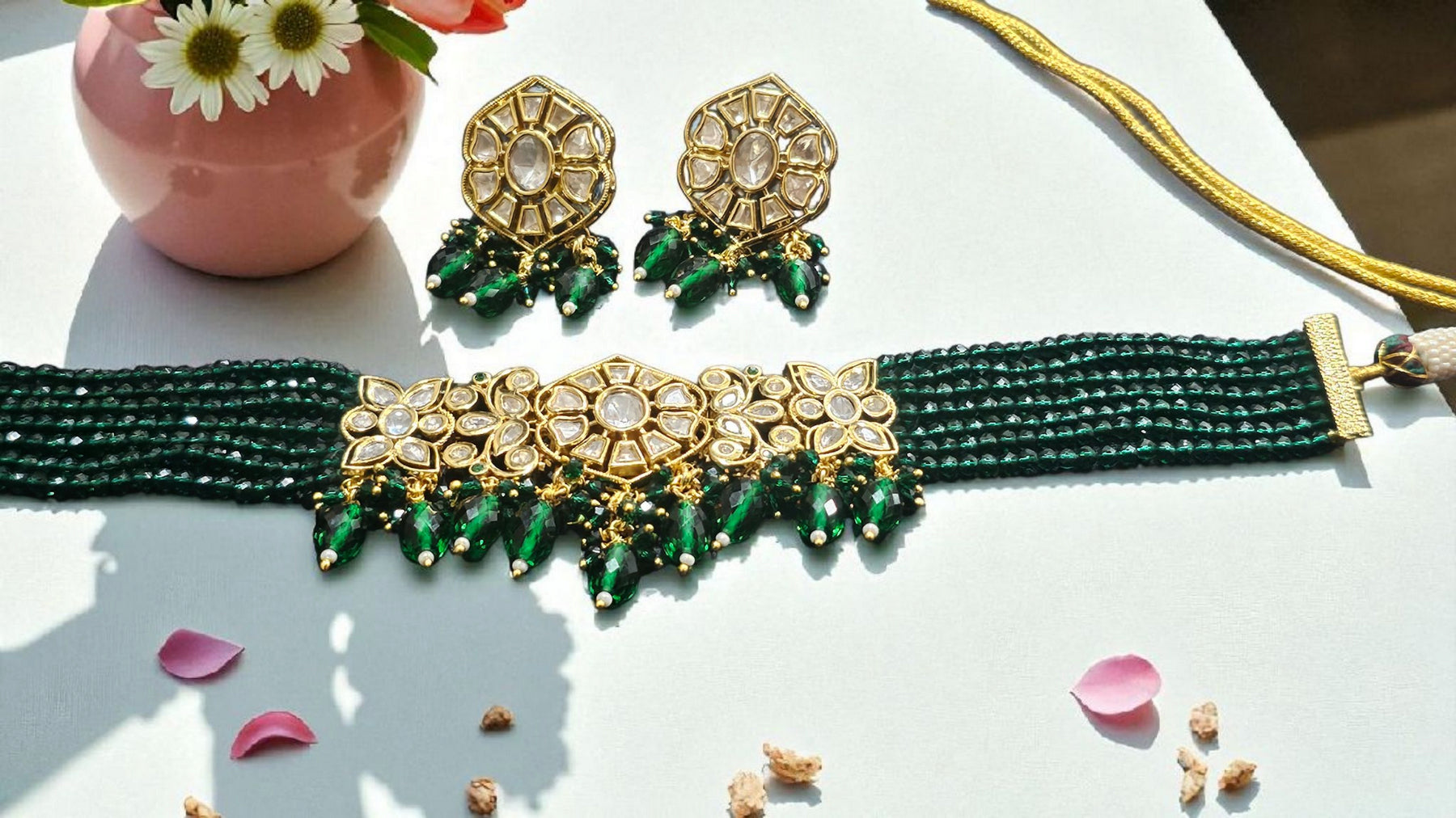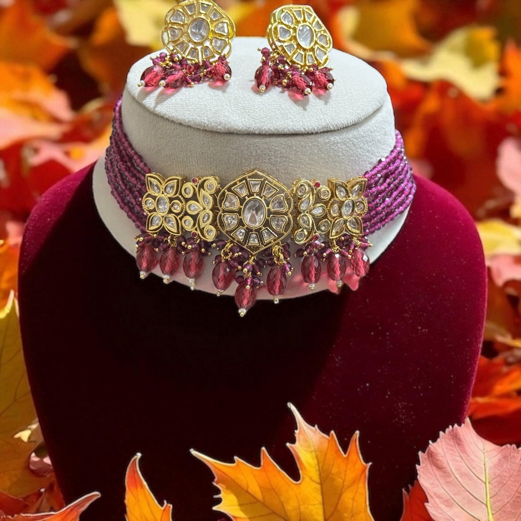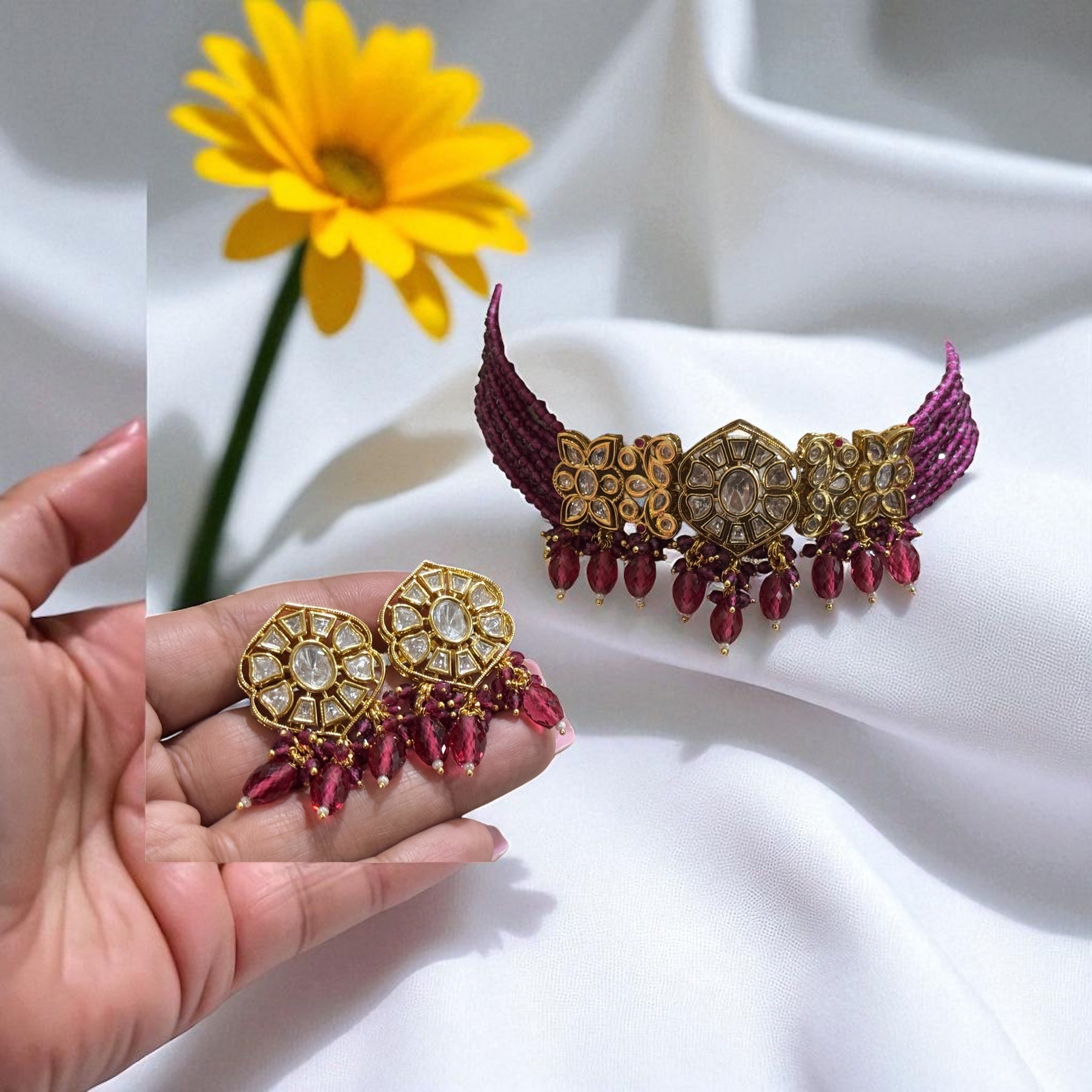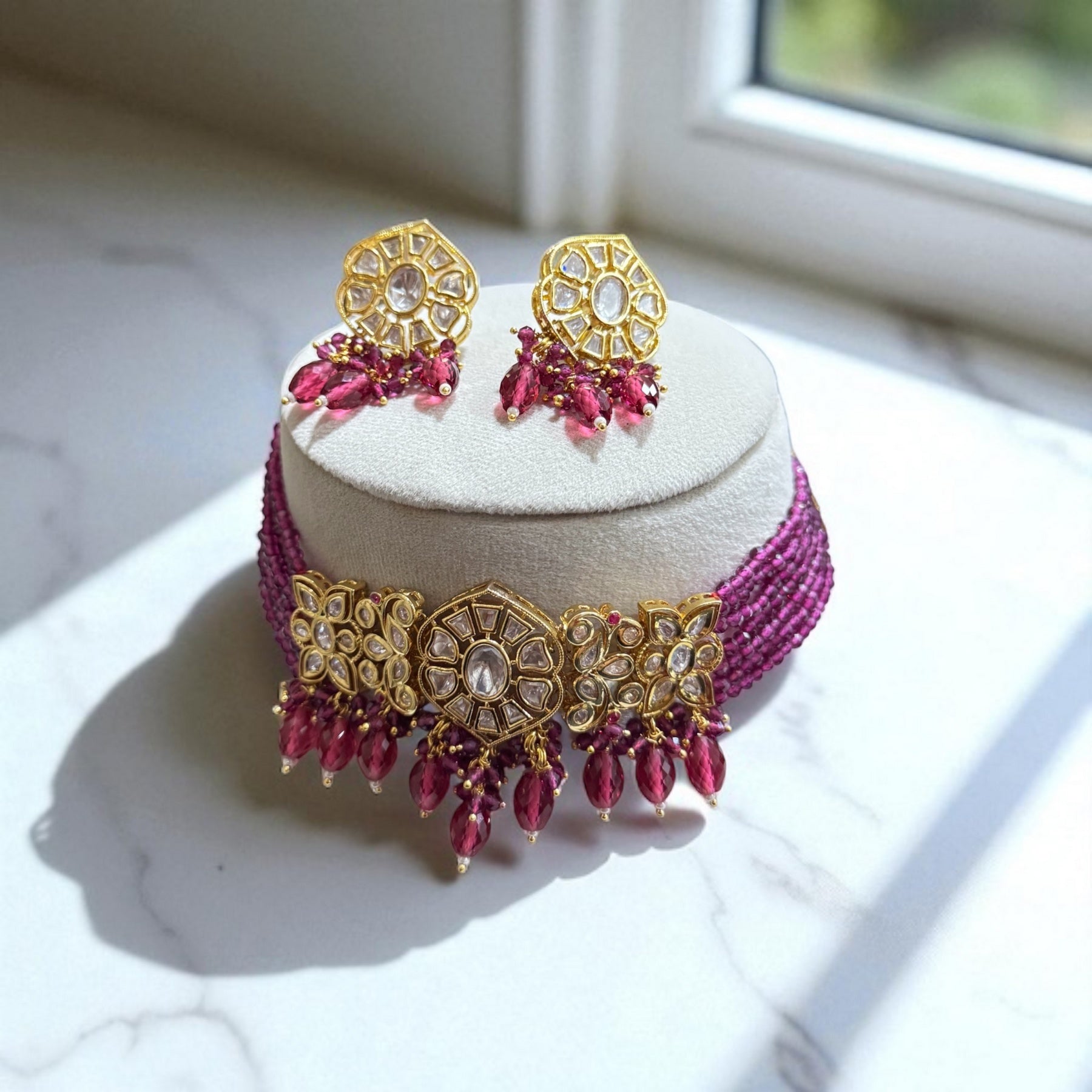 Box Contains – Beautiful Coloured Stones Neckpiece attached to same coloured beads mala chain and hanging drops with pair of beautiful Earrings making it a Royal Elegance