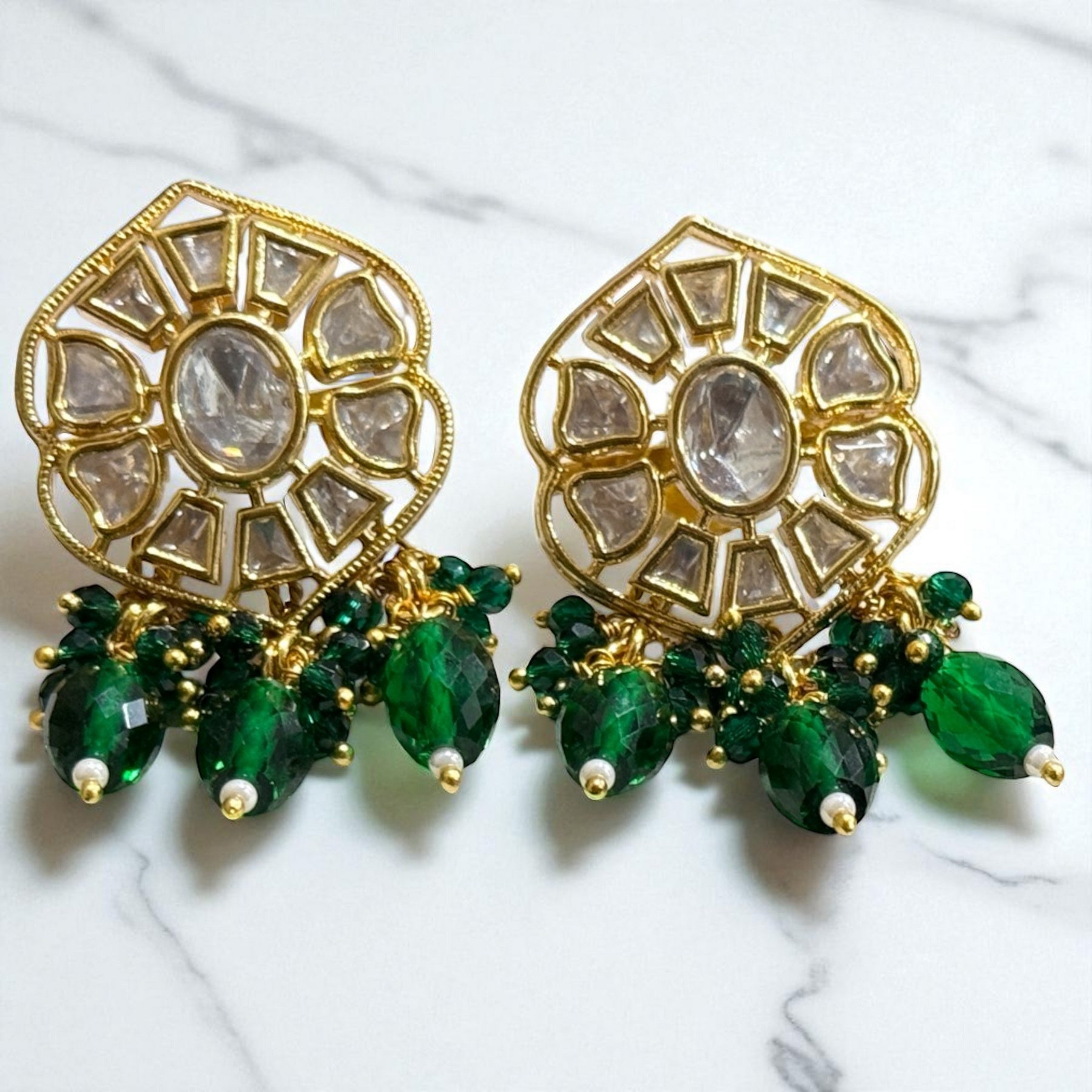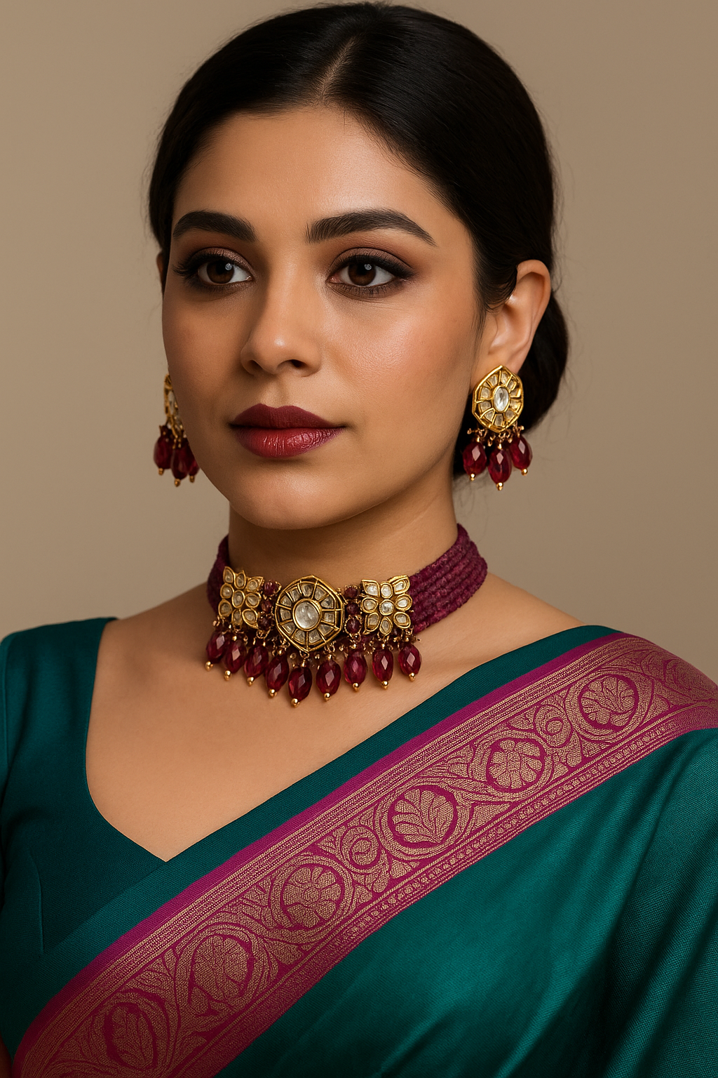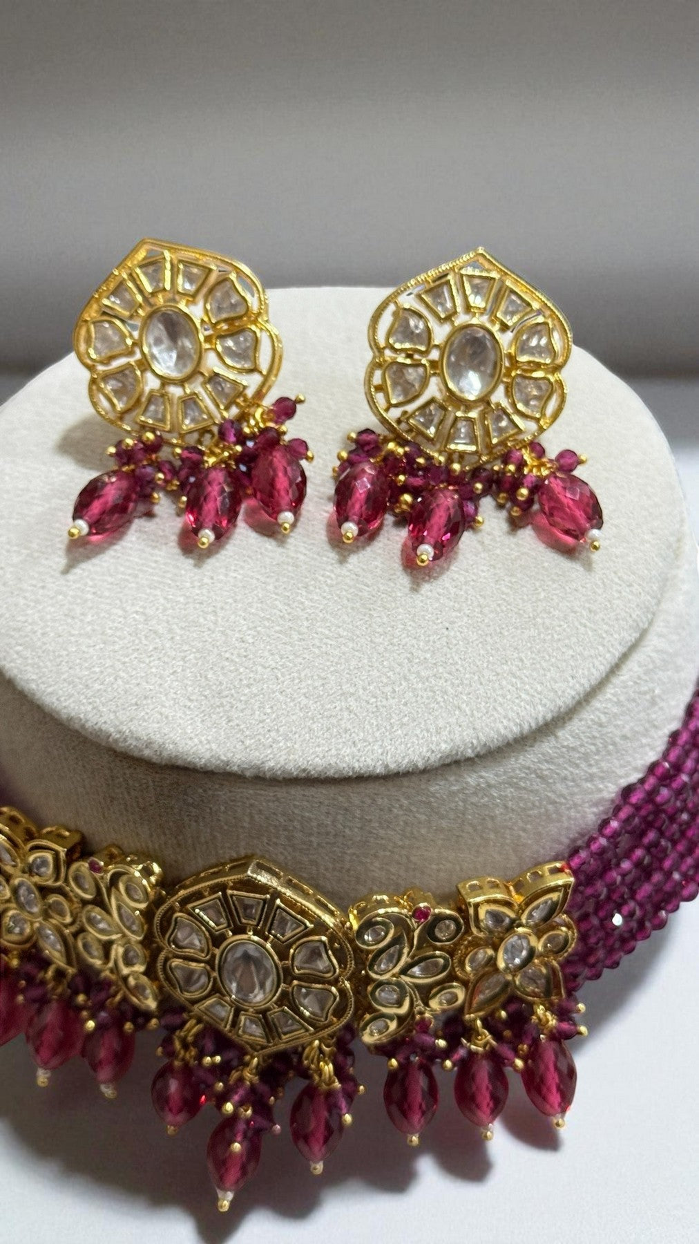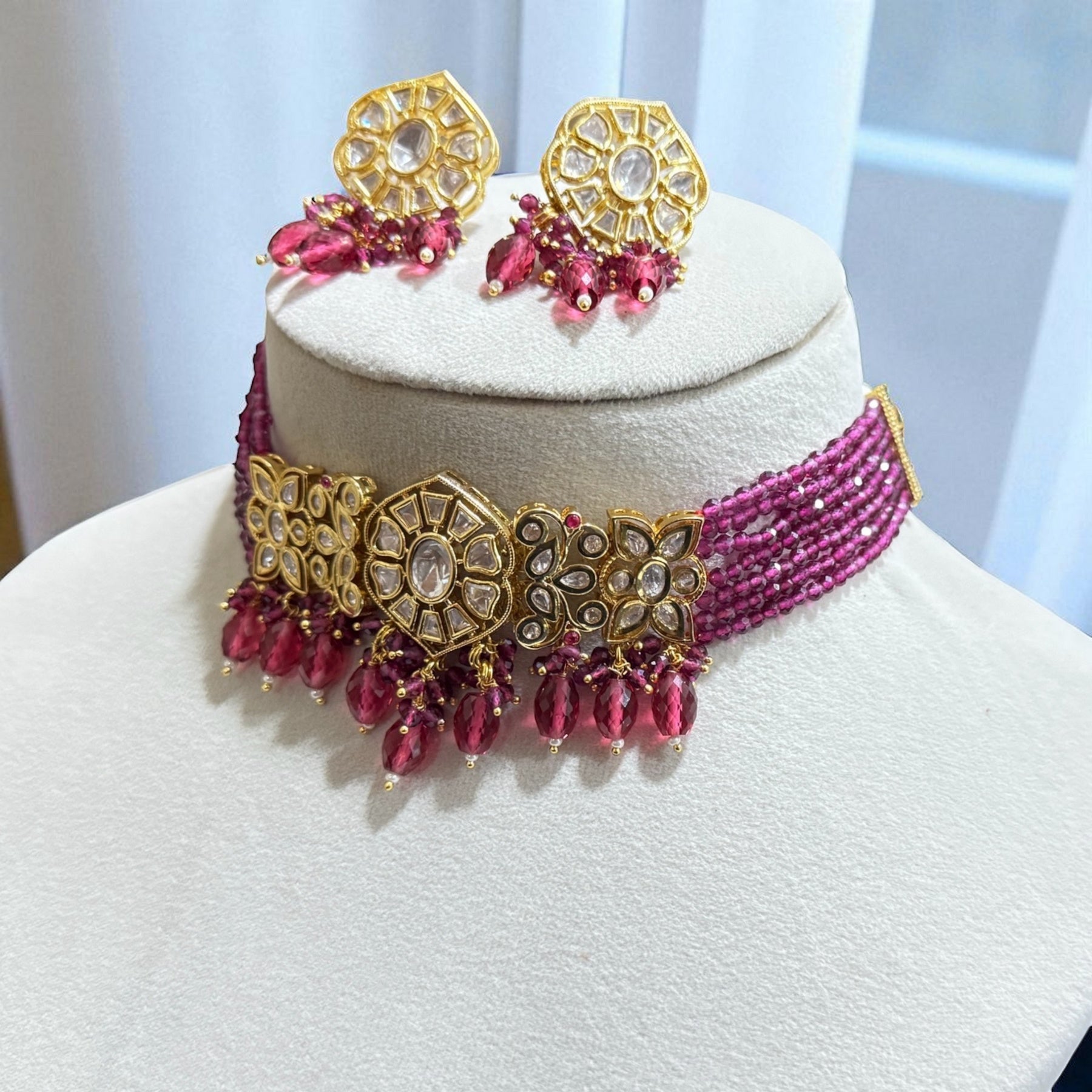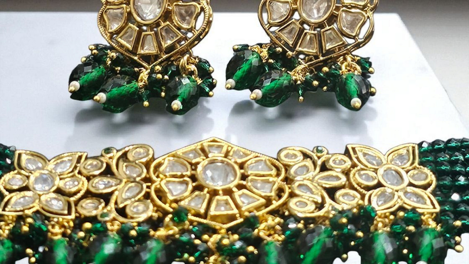 Box Contains – Beautiful Coloured Stones Neckpiece attached to same coloured beads mala chain and hanging drops with pair of beautiful Earrings making it a Royal Elegance